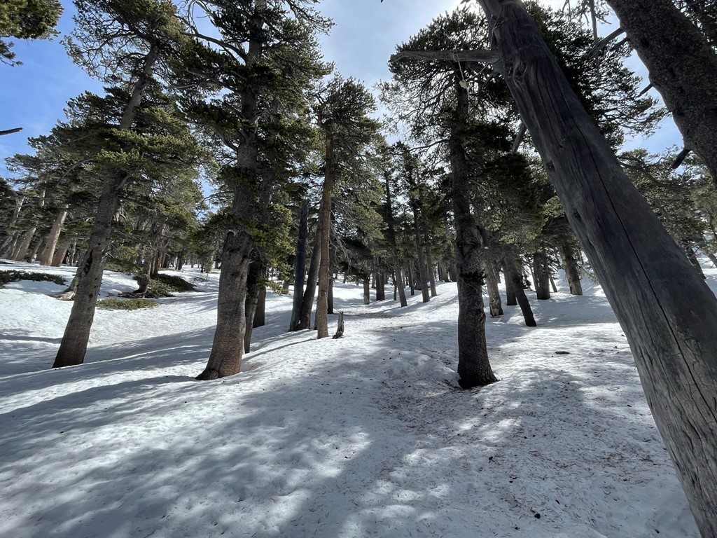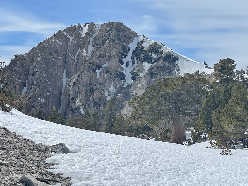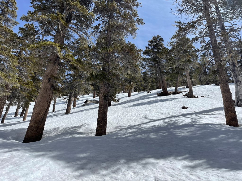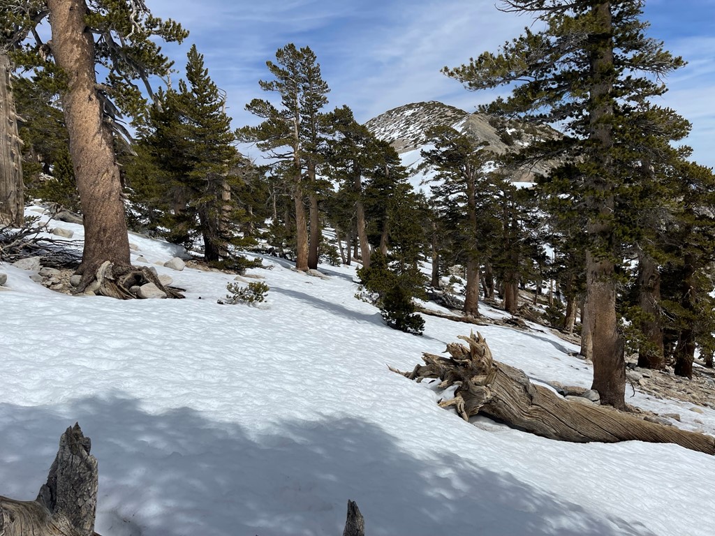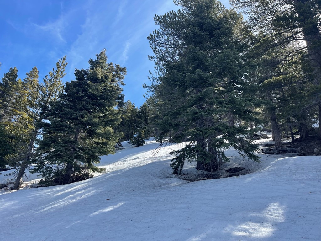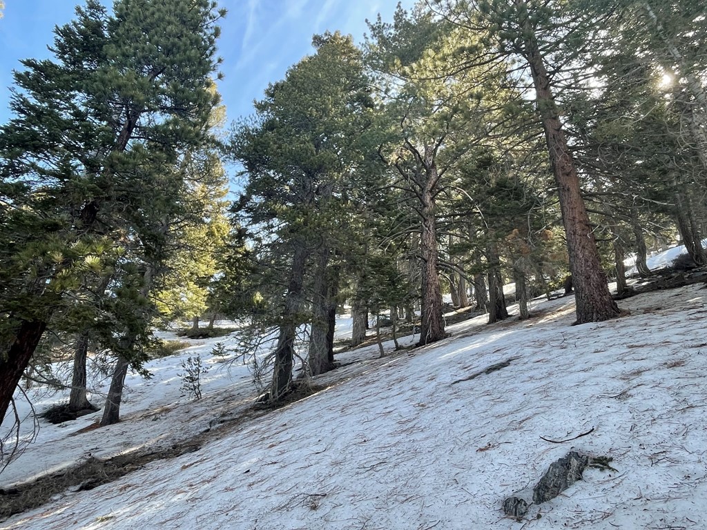 I reached the summit at 1:18pm at 6.7 miles! I did not locate a register. It was warm enough that I was comfortable in short sleeves, which seemed kind of crazy for 10800 feet in March. The views were pretty good despite some haze. I could see Bighorn Mountain ¾ mile to the east.