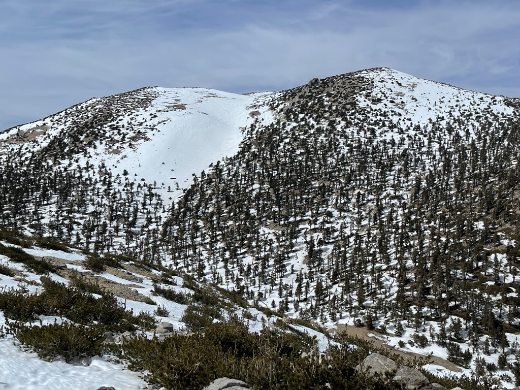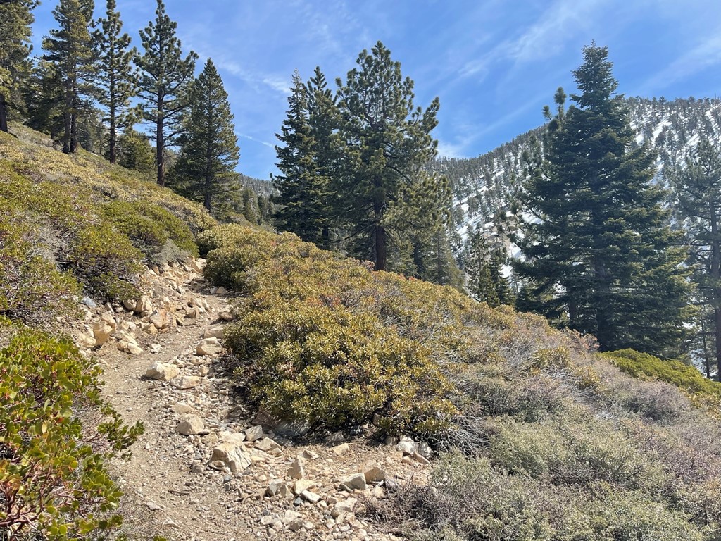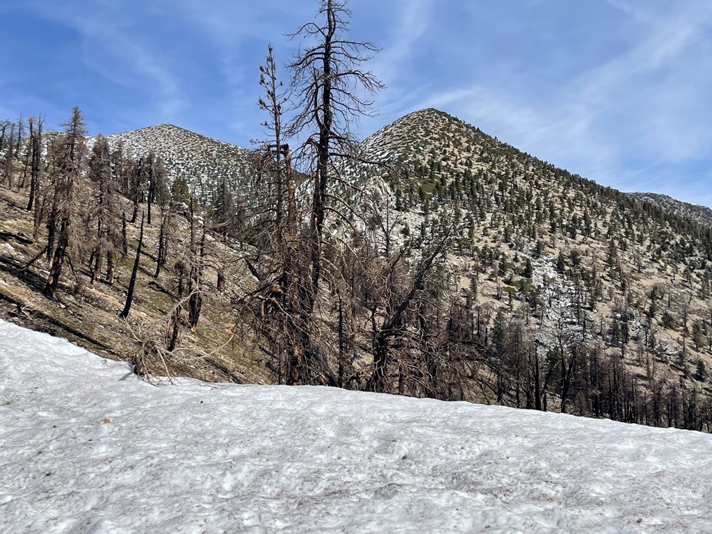 I reached the top of the switchbacks around 9800 feet. San Gorgonio (left) and Dragons Head (right) came into view. Bighorn was hidden behind Dragons Head.