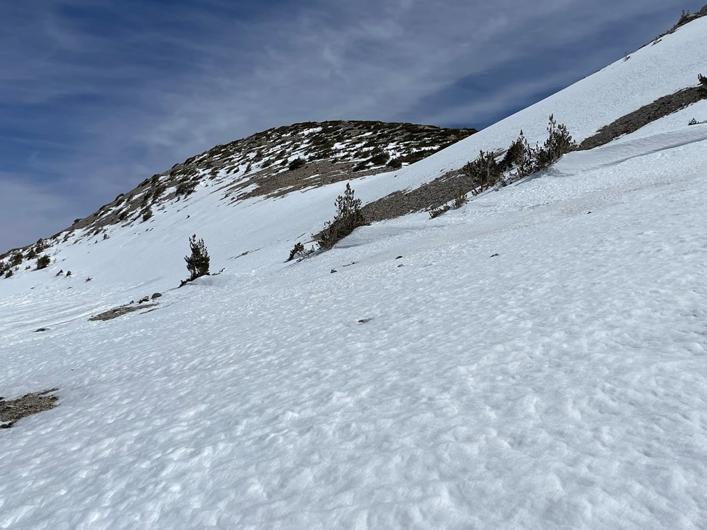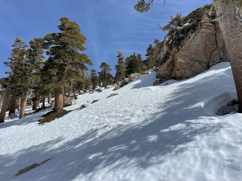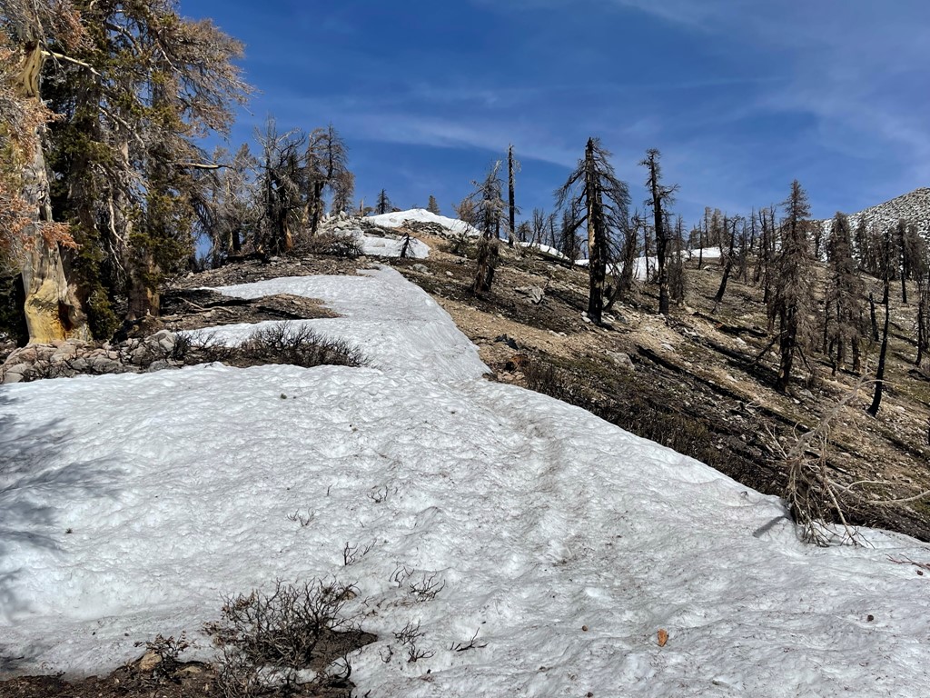 I reached the top of the switchbacks around 9000 feet. I found the trail again and continued east. This section of trail was dry, so I removed my crampons.