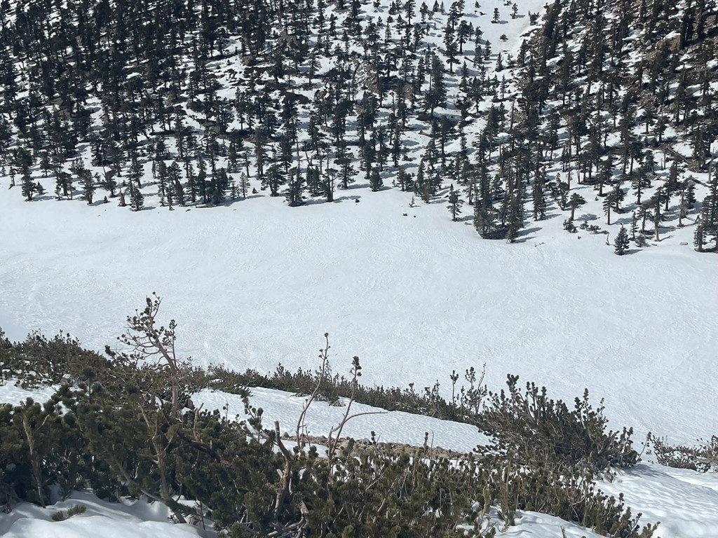 There is another series of switchbacks above High Creek. They were covered in snow so I left the trail, put my crampons on, and climbed directly up the steep icy slope.