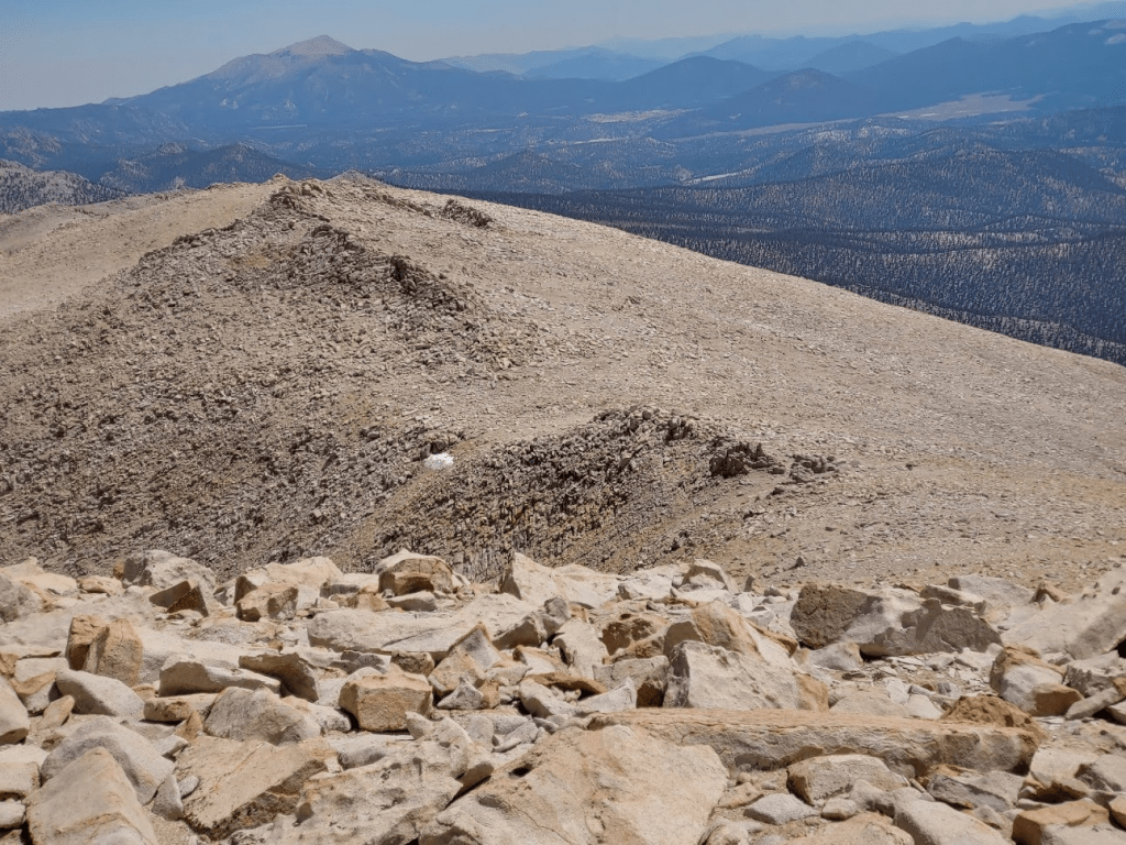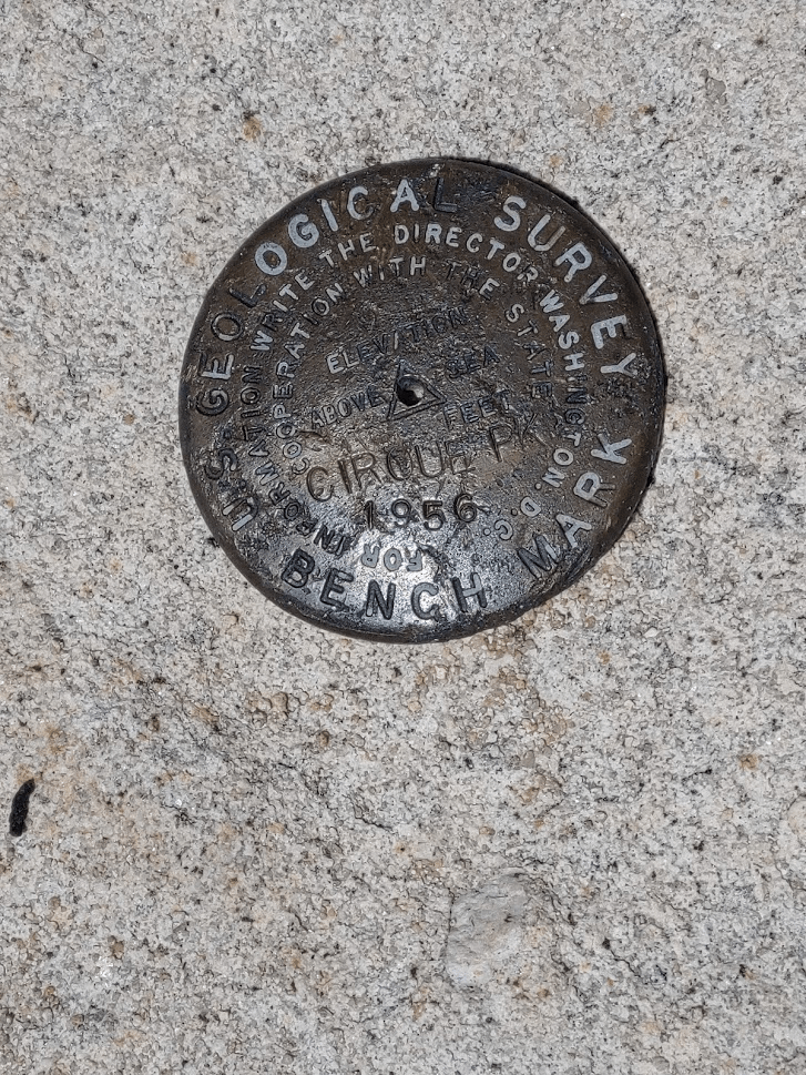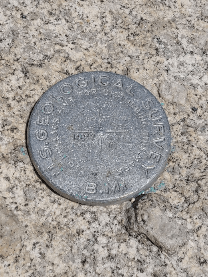 What a hike so far! The weather was ridiculously beautiful – not a cloud in the sky and no wind. I was comfortable in my T-shirt even above 14,000 feet. There were about 10-15 other people on the summit. There were 2 ammo boxes each containing multiple register books. I signed the newest one which had been placed in 2019. I located just one benchmark. Interestingly, it is labeled “14042” even though the official elevation is 14,026. The benchmark must be fairly old, and a new survey must have been done since it was placed.