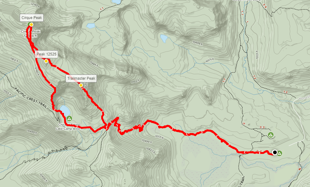 I soon left the trail and started making my way cross country to the northwest. My plan was to go up and over 2 bonus Peakbagger peaks on the way to Cirque: Trailmaster Peak (12,336 ft) and an unnamed peak (12,525 ft).