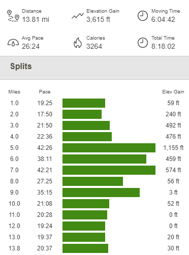 I passed a few hikers going each way on the way down. I finally reached the car once more at 1:46pm. This hike was 13.52 miles, 5292 feet elevation gain, and 8:18:39 total time.