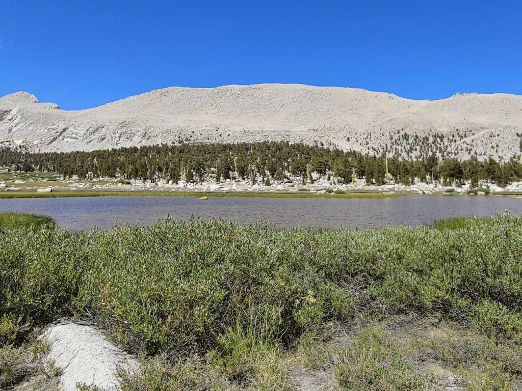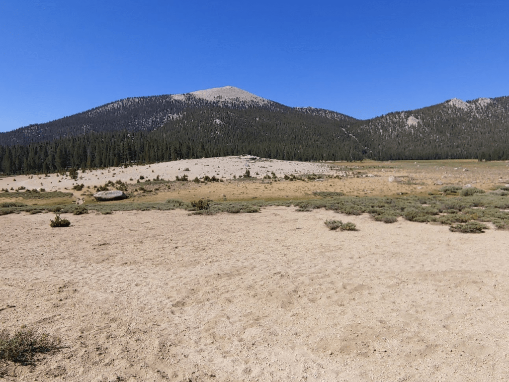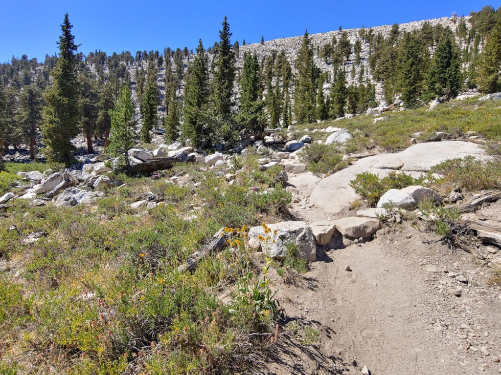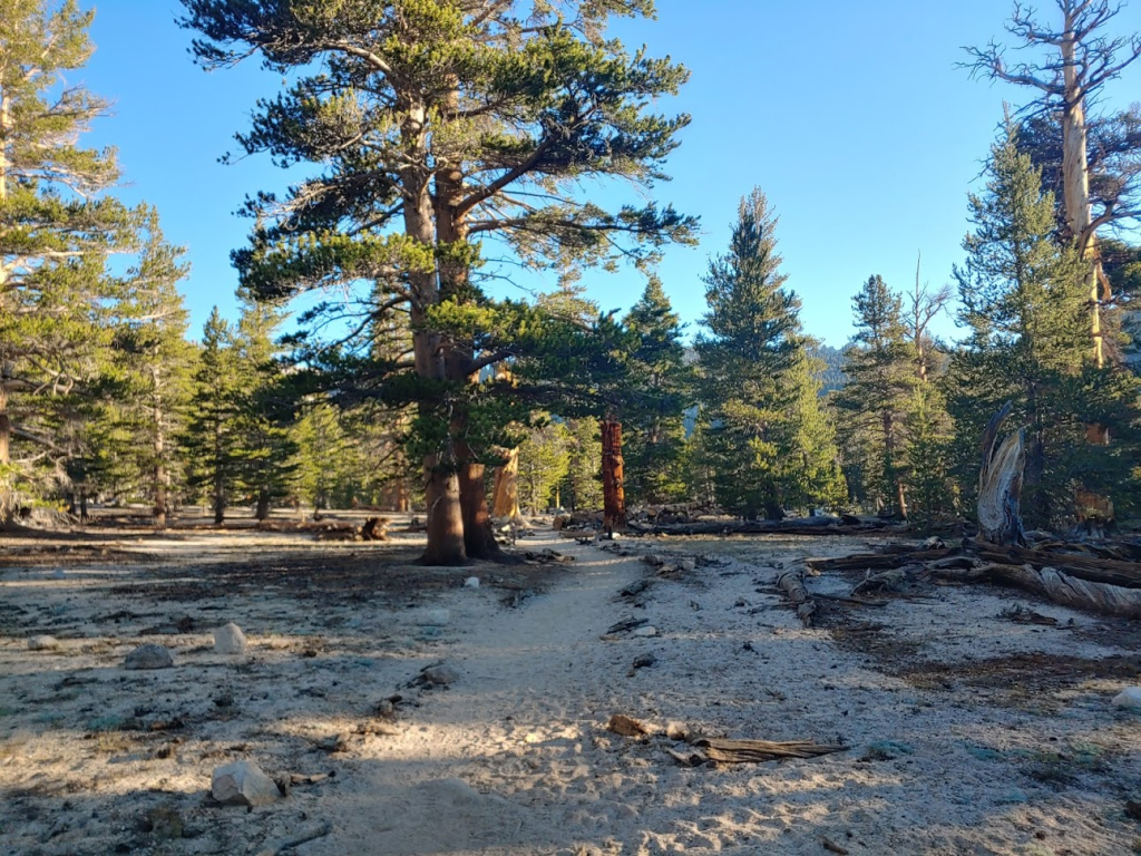 The weather couldn’t have been more perfect. Not a cloud in the sky and I was comfortable in short sleeves. I soon reached Horseshoe Meadow. The peak rising just above the tree line is Trail Peak.