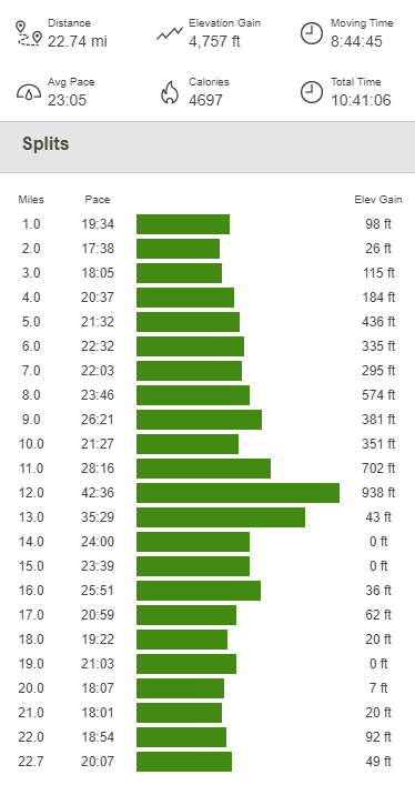 At 18.69 miles I reached the fork where the New Army Pass and Old Army Pass trails split apart. From there it was 4 miles back to the trailhead. I finally reached the car once more at 4:57pm. This hike totaled 22.74 miles, 4757 feet elevation gain, and 10:41:06 total time.