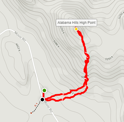 What a hike! This was probably one of my favorite hikes I had ever done. The lakes were absolutely beautiful, and the summit views were incredible. I ate some dinner and then left the trailhead. I drove back down to Lone Pine where I filled up my gas tank and got some ice for my cooler. I had a little time to kill, so I decided to explore the Alabama Hills a little. The Alabama Hills are a group of small hills and rock formations in the desert west of Lone Pine and east of the Sierra. They have famously been used as the set for dozens of old western films. I decided to climb the high point of the small range, which is 5381 feet above sea level. I drove west from Lone Pine on Whitney Portal Road and then turned right (north) onto Movie Road. Movie Road is a well graded dirt road that cuts through the middle of the hills. I parked about a half mile southwest of the high point and started hiking at 6:51pm from 4747 feet.