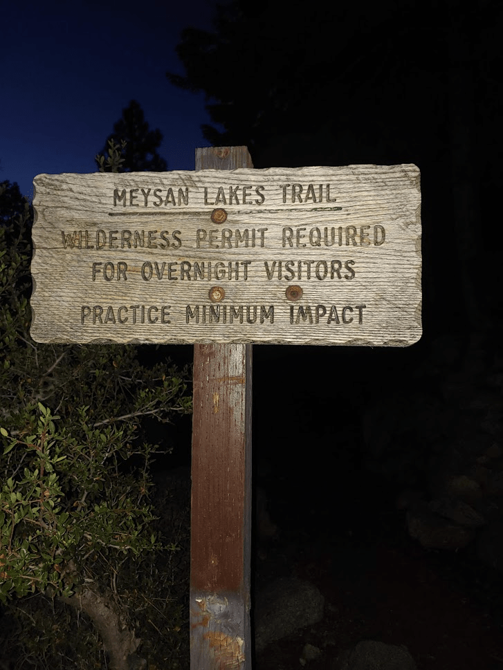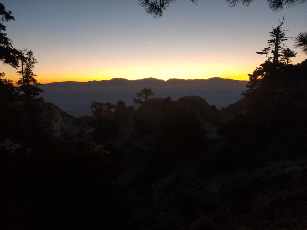 The trail goes up from the campground a short way and then follows a road past some more summer homes. The trail then leaves the road and heads into the forest at 0.5 mile. It was just light enough that I didn’t bother to put on my headlamp. The sun was beginning to light up the sky to the east above the Inyo Mountains.