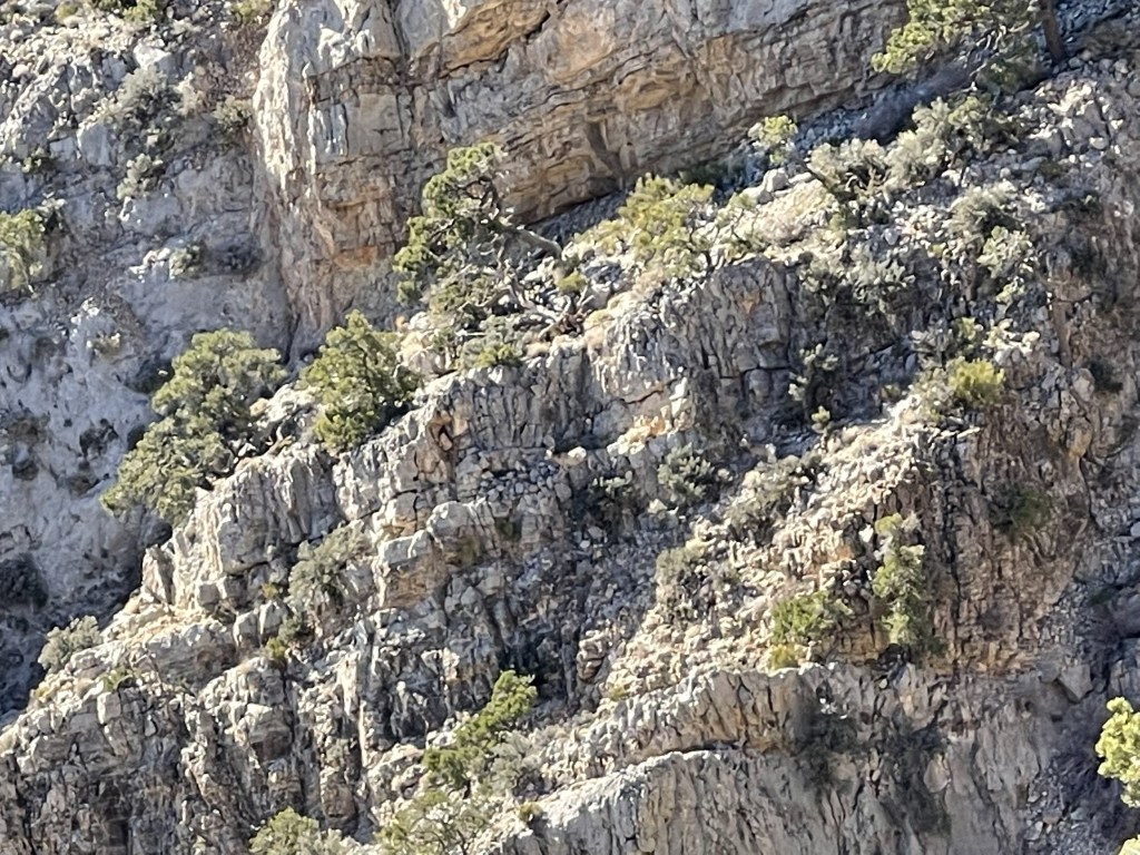 As I got closer, I heard the sound of rocks falling and I saw 3 bighorn sheep scampering down from just below the summit. I had a good view of them for a minute or two as they ran down and off to the left. They eventually disappeared behind a ridge, but I managed to get a few blurry pictures. If you look closely at the picture below, at least 2 of them are noticeable in the center.