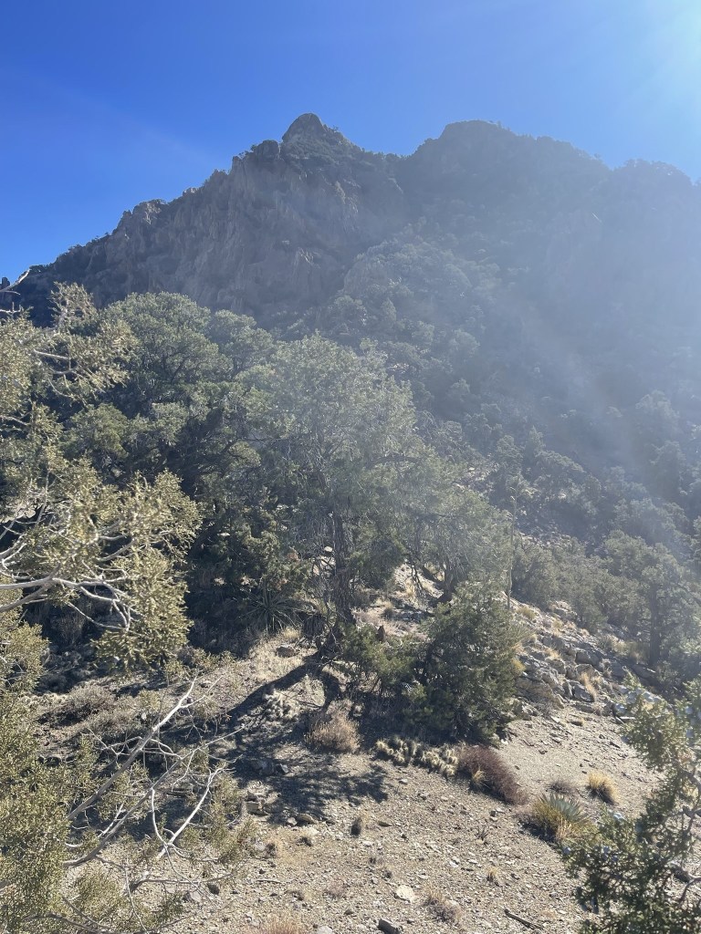 I then hiked southwest across the desert for a short way to the base of Mitchell’s east ridge. Edgar Peak can be seen on the far left and Mitchell’s east ridge is in the center.