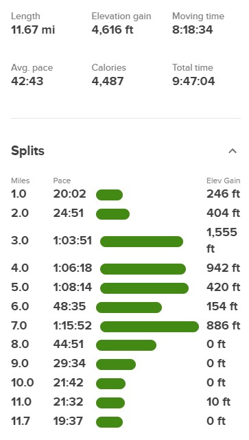 I reached the bottom of the canyon at 9.1 miles. I then walked ENE across the open desert for about 2.5 miles to reach my car again. I had to roll myself underneath a barbed wire fence at the boundary between the state park and Mojave National Preserve. I reached the car at 3:22pm. Stats for this hike were 11.67 miles, 4616 feet elevation gain, and 9:47:04 total time.