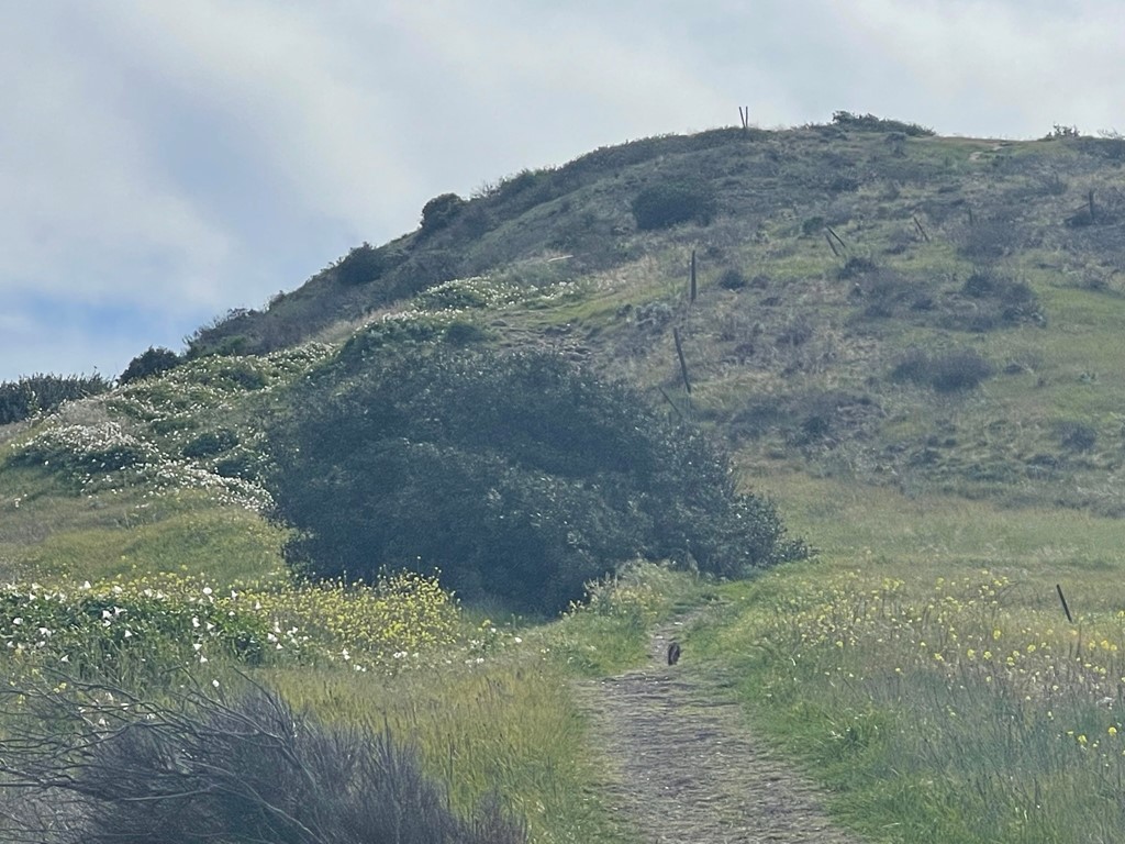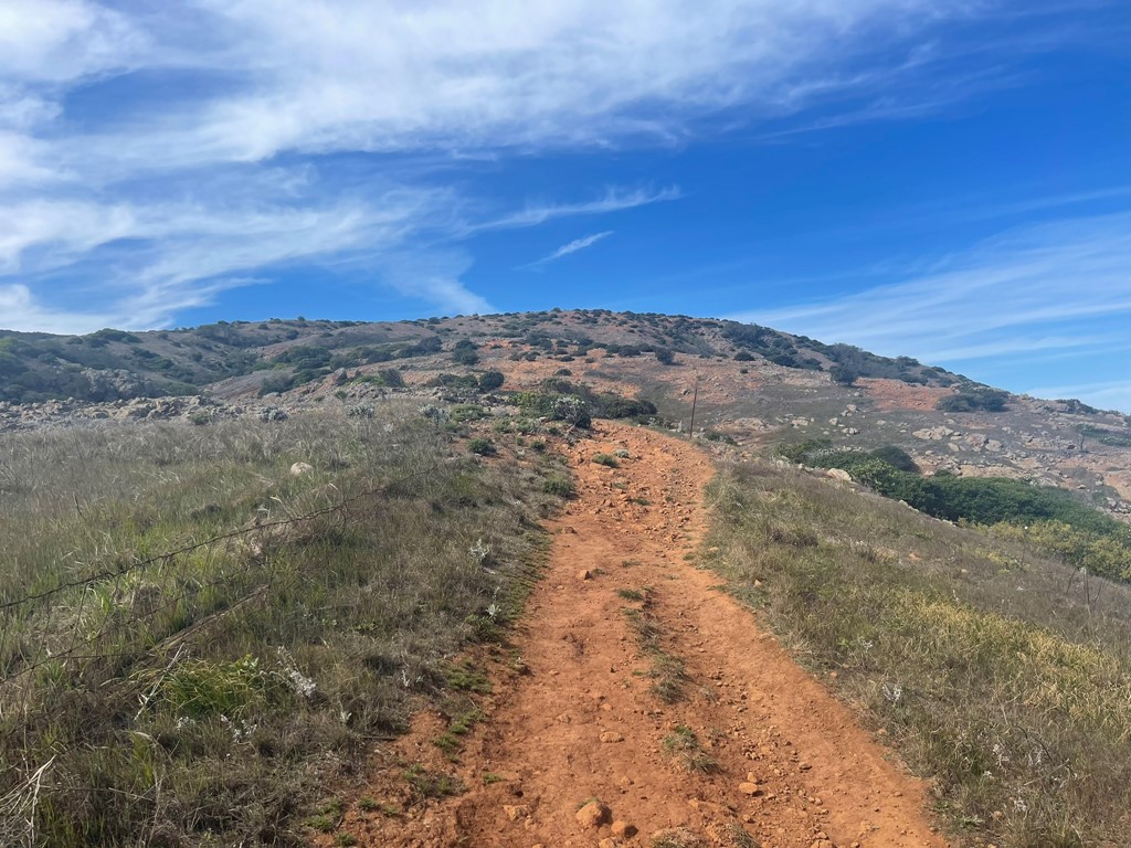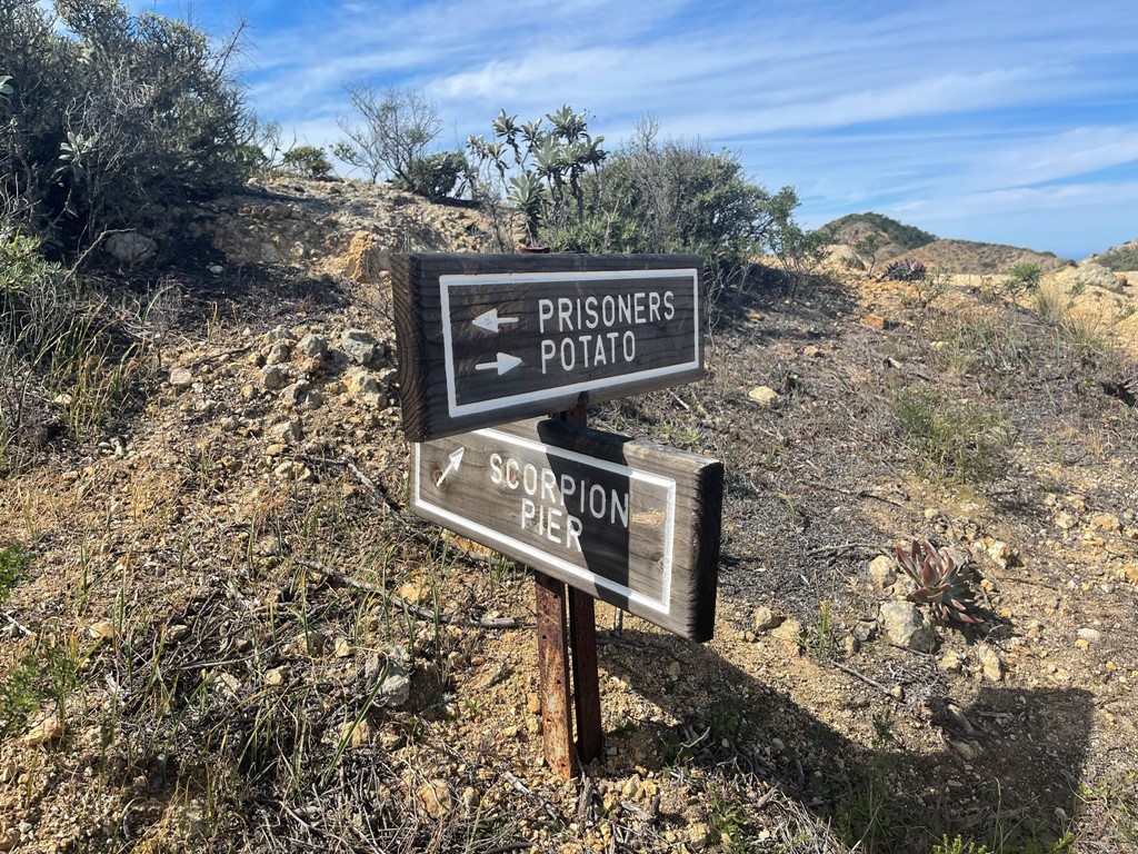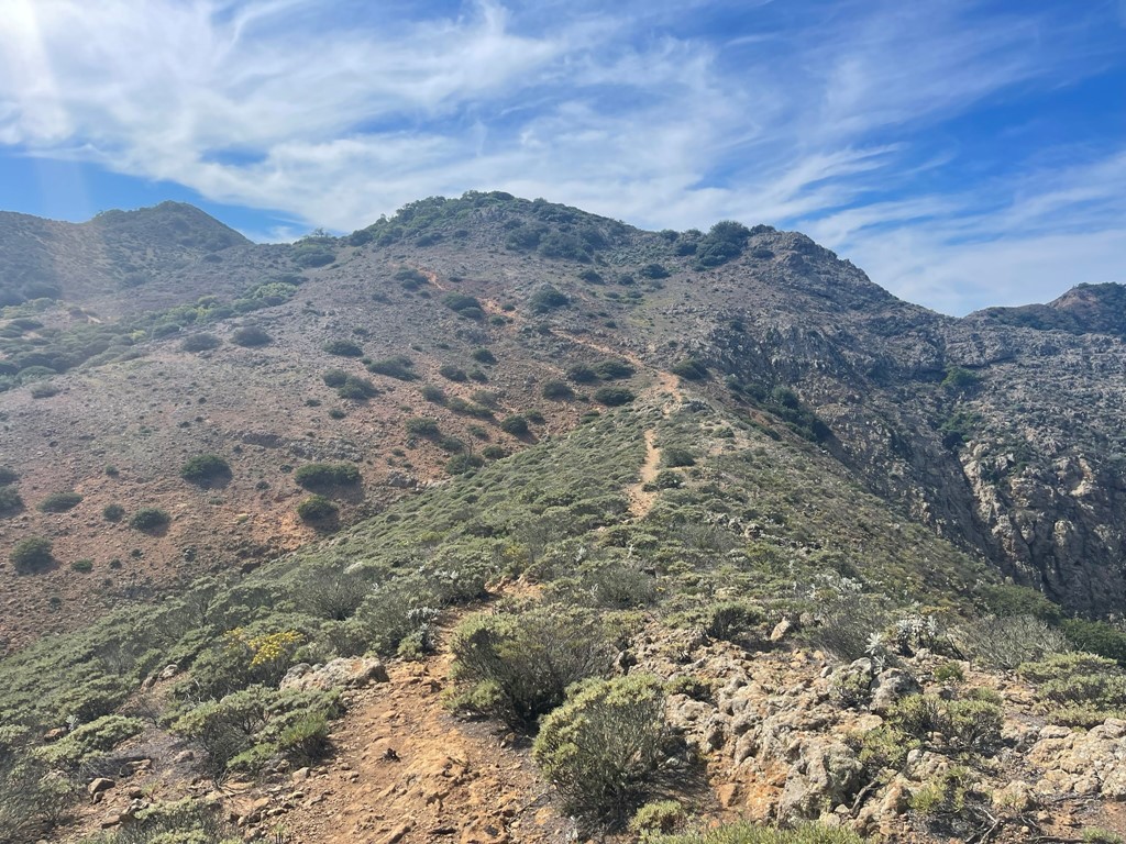 We reached a 3 way trail junction at 2.2 miles. Left would take us to Smugglers Road which leads back to Scorpion Harbor (which would be our descent route). We went right towards El Montanon.