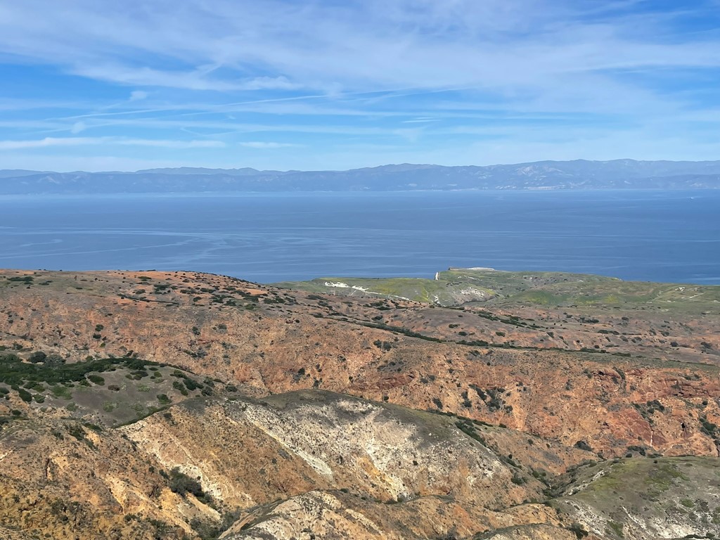 Alexia stopped and waited for me about a half mile from the summit. I hiked up and reached the bump with a small radio installation and a few solar panels. There were 2 guys here resting and eating a snack. I realized the actual peak was the next bump to the east, so I just said a quick hi and then hiked to the true summit. I was standing on top at 12:09pm at 4.5 miles. This was my 10th national park high point which was pretty cool. I signed the register which had been placed May 23, 2021. The previous entry was from January 29, which I found surprising. I’m guessing a lot of people stop at the radio installation thinking they’ve reached the actual summit. The views were great despite some thin clouds. To the west I could the other side of the island, including Devils Peak. At 2450 feet, Devils Peak is the highest point on Santa Cruz Island and the entire Channel Islands. The western half of the island, including Devils Peak, is outside the national park boundary which is why El Montanon is the national park high point.