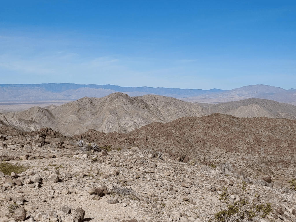 I signed the register which had been placed by the same party that placed the register on Fish Benchmark in 1979. This register had quite a few more entries, but still not a ton. The previous entry was March 9th. This peak isn’t on any list, so it probably gets overlooked frequently. I was kind of surprised that Andy Zdon doesn’t include it in his book, since the peak is a wilderness high point and it’s actually the most prominent peak in Imperial County (the highest peak elevation-wise in Imperial County is Blue Angels Peak near the Mexican border). But he includes over 300 peaks in his book, so I guess he can’t write about every single desert peak in California. The views were pretty incredible on such a clear day. I could see Fish Benchmark just a few miles away to the northeast.
