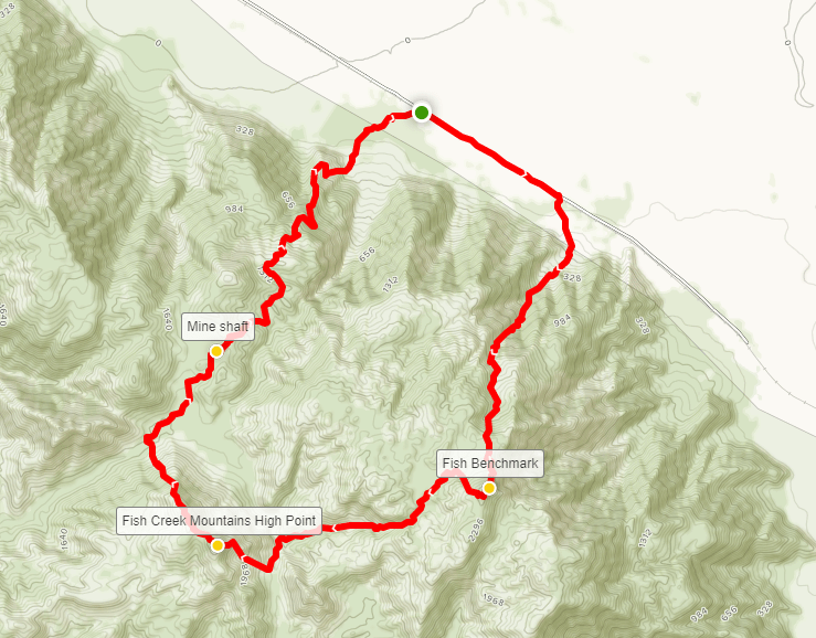Peakbagger refers to this peak as Eagle Benchmark instead of Fish Creek Mountains High Point. I looked around the summit area but didn’t see any evidence of a benchmark. In no rush, I took my time on the summit enjoying the views and soaking up the sun. It was getting warm, probably upper 70s now. After about 50 minutes, I began the descent. I went northwest on the ridge towards a subsidiary summit.