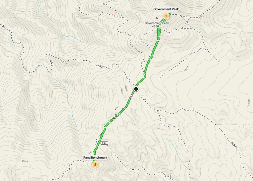 Government Peak (4741 ft) and Rand Benchmark (4737 ft) are a pair of summits just off US-395 near the little town of Red Mountain. Government Peak has over 1000 feet of prominence and both peaks are included in Zdon’s book. I was on my way from climbing Manly and Needle in Death Valley and had some extra time. These aren’t the most exciting peaks in the world, but they were a quick detour off the highway and would be an easy hike for my tired legs. From US-395, I went southwest on Osdick Road, then southwest on Randsburg Mojave Road, then west on BLM Road R20, then northwest on a dirt road heading towards the peaks. I parked at an intersection right in the middle of the 2 peaks. The roads up to this point was in good shape and passable for most cars. I began hiking at 1:59pm from 4505 feet above sea level.
