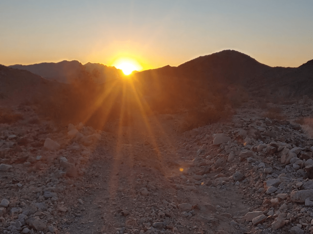 The road got extremely rough past this point as it crossed a few more washes. The sun began to rise above the mountains behind me.