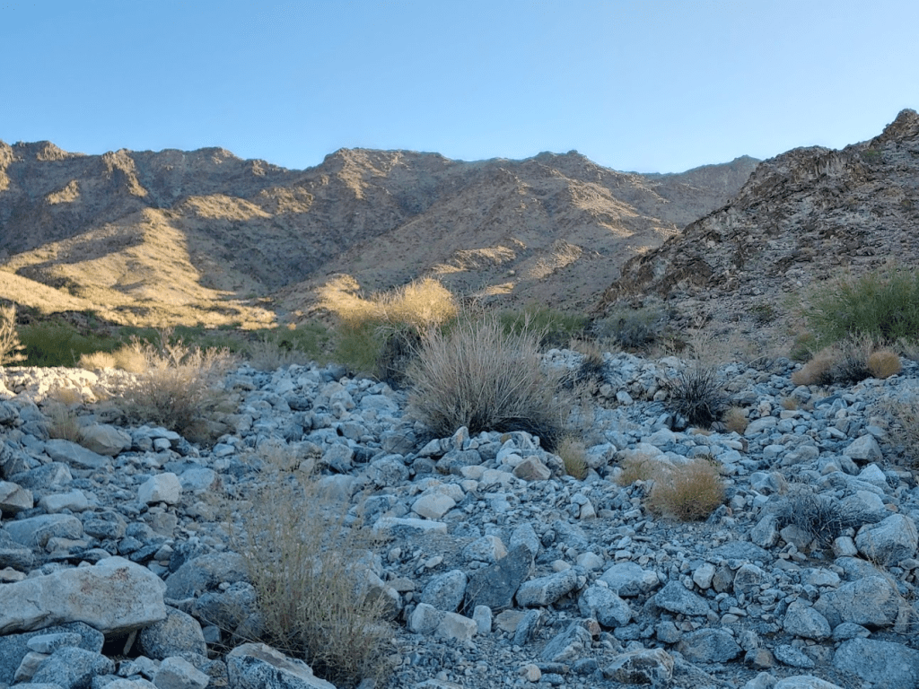 I woke up Sunday morning at 5:15am and quickly got ready to climb Granite Mountains High Point (4331 feet). Of course, “Granite” is just about the most generic name for a mountain I can think of. It’s not even the only Granite Mountain on the Desert Peaks Section list. The other is in Mojave National Preserve, and the two are actually close enough to see from the other summit. There is even a Granite Mountain in Anza Borrego State Park, which isn’t on the DPS list, but a fine peak all the same. I had driven in the night before, opting for the much longer, but easier eastern approach from Blythe. It is about 12 miles west on well graded Arlington Mine Road, and then another 10 or so miles northwest on Palen Pass Road. Palen Pass Road was pretty sandy in places and the wash crossings made it a little rough at the end. I would recommend high clearance and I was definitely happy to have AWD (but probably not required). I started hiking at 5:49am from 1557 feet.