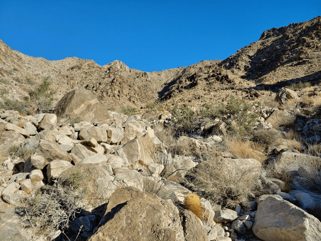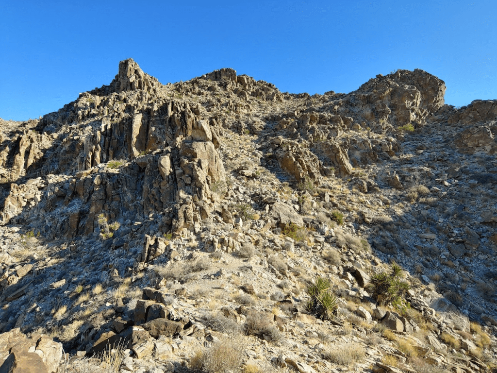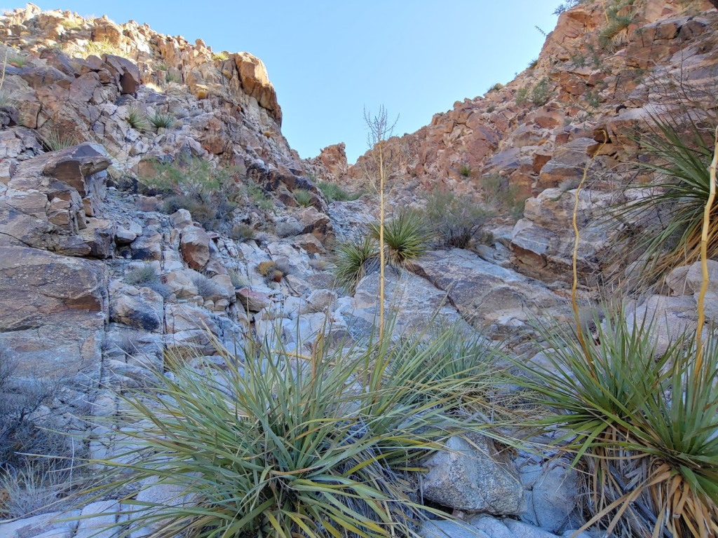 The 2 standard DPS routes diverge around this point. Route A continues up the wash, while route B ascends a ridge just to the west. I decided to ascend route A and descend route B, so I continued up the wash. It was very rocky, and my legs were a bit tired from the day before.