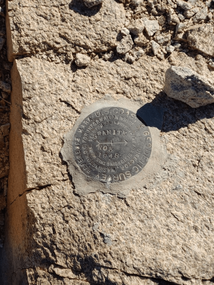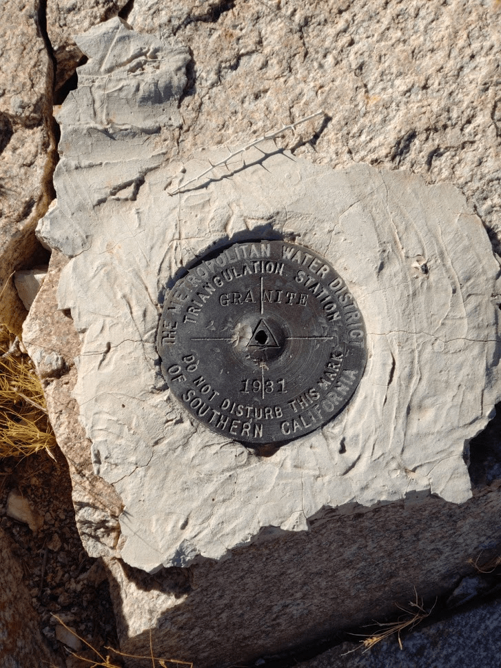 I signed the register which had been placed in 2000 by a party from the nearby China Lake Naval Base. The previous ascent was in March. I located the benchmark and reference marker no. 3