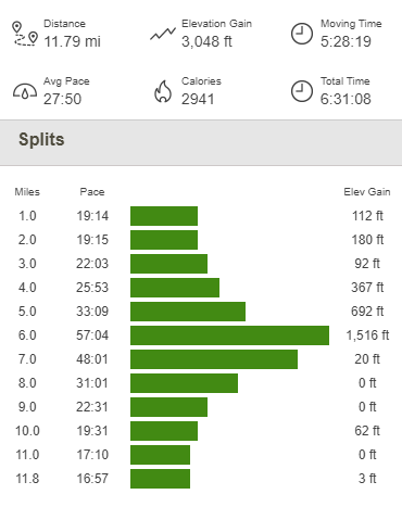 I reached the road again at 9.32 miles. From there it was an easy walk back to the car. I was done finally at 12:19pm. This hike totaled 11.79 miles, 3048 feet elevation gain, and 6:31:08 total time.