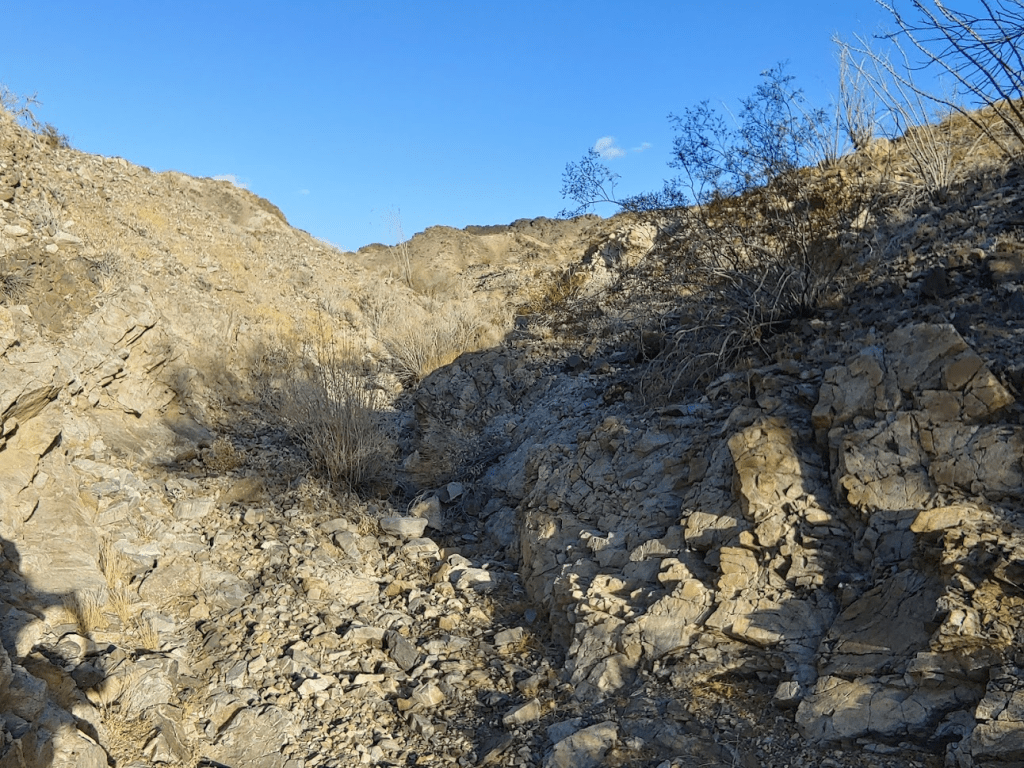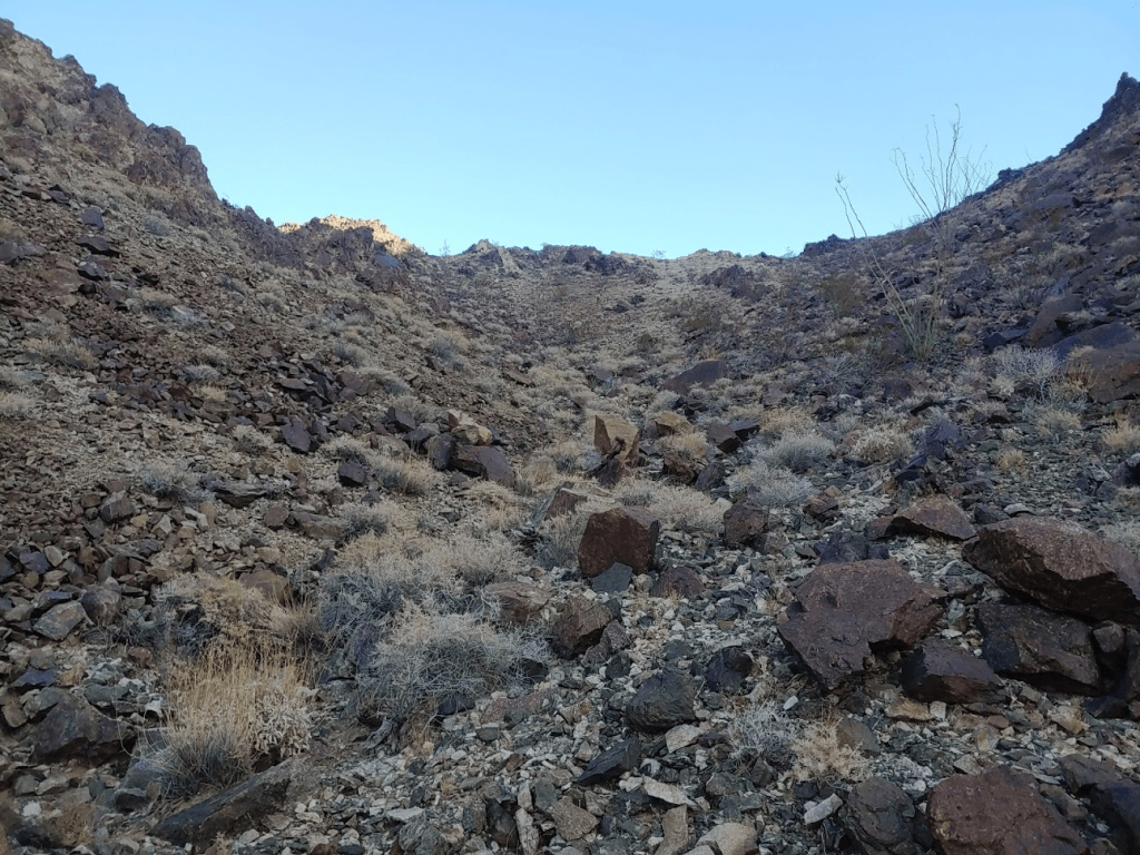 The wash meandered to the north and then bent back to the south. Eventually I climbed up a rocky slope.