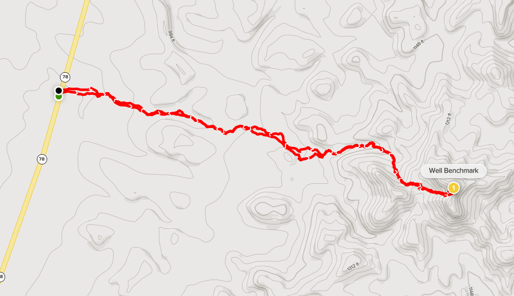 I had one final peak to do before heading home (this last one would be a real hike): Well Benchmark, which is the high point of the Buzzard Peaks Wilderness at 1604 feet. I drove back to Highway 78 and then went just a few miles south and parked on a nice wide spot on the west side of the road. I started this hike at 2:46pm from 987 feet.
