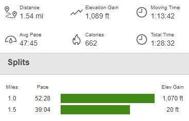 I made it back to the car 11:25am. This hike totaled 1.54 miles, 1089 feet elevation gain, and 1:28:32 total time.
