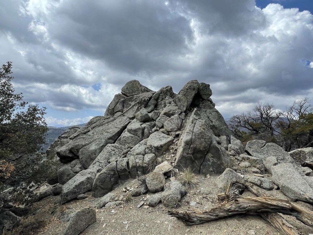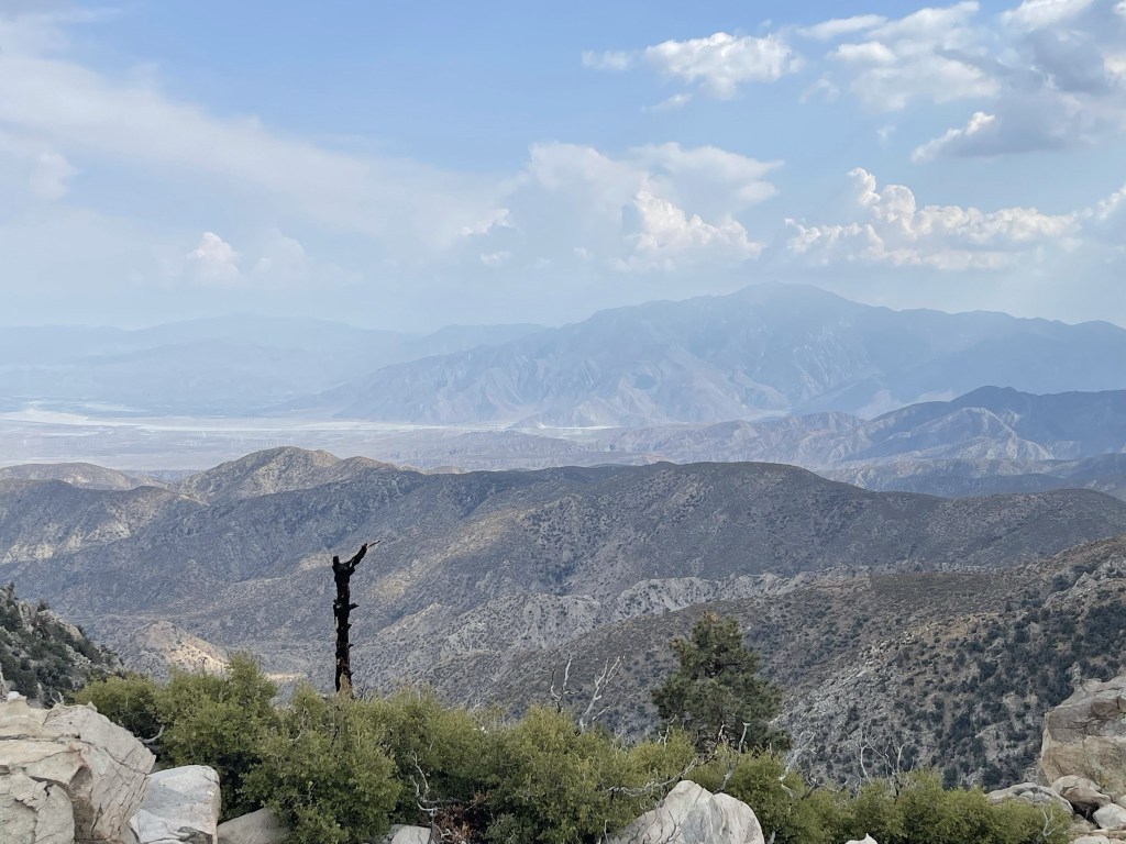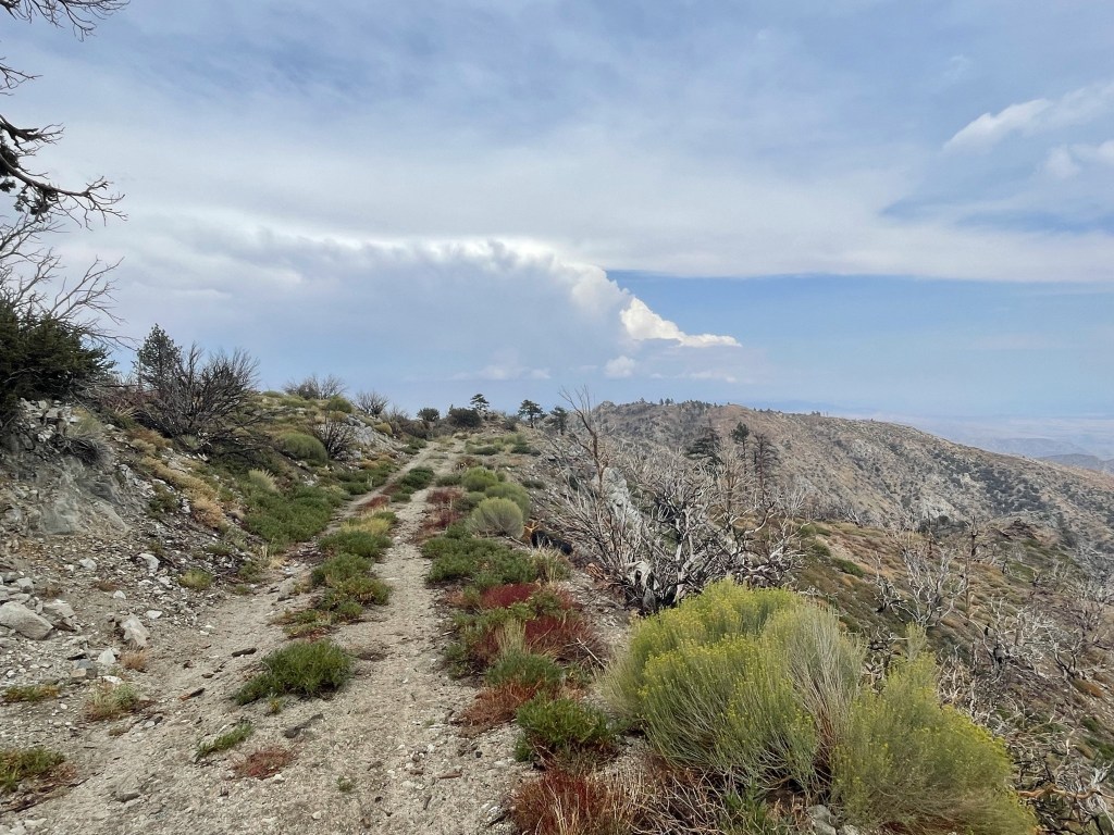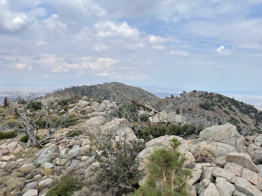 I reached the top at 4:08pm at 7.3 miles! While I was on the summit, I figured out that I was not actually standing on Three Sisters. I read some old trip reports and learned that the 3 peaks are located about a mile east, but the HPS summit was moved to this peak in 2001 due to private property concerns. I located a register can but unfortunately it was jammed shut so I was unable to sign it. It was still pretty cloudy which obscured the views somewhat. I could see San Jacinto to the south.