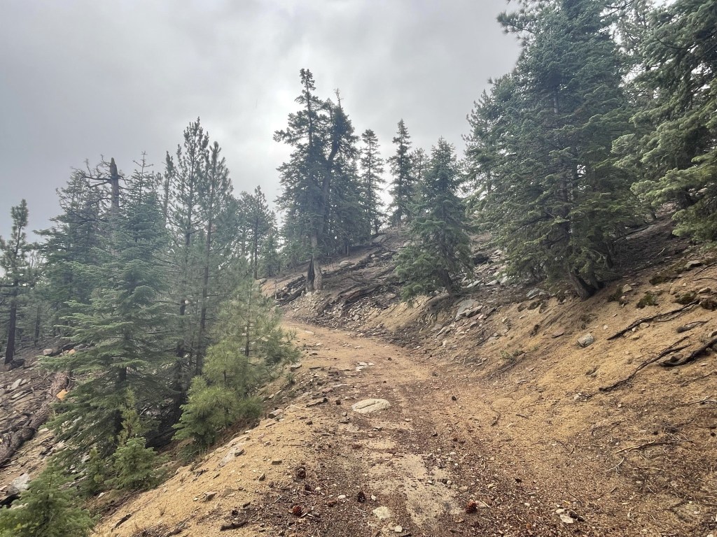 I climbed down from the summit and made my way east towards the PCT again. I crossed over the PCT and reached a 4WD road at 2.8 miles. I had noticed a 4WD road on the map that seemed to go back down towards Forest Road 1N02, but slightly east of the PCT which would put me closer to Three Sisters. It was still raining pretty good.