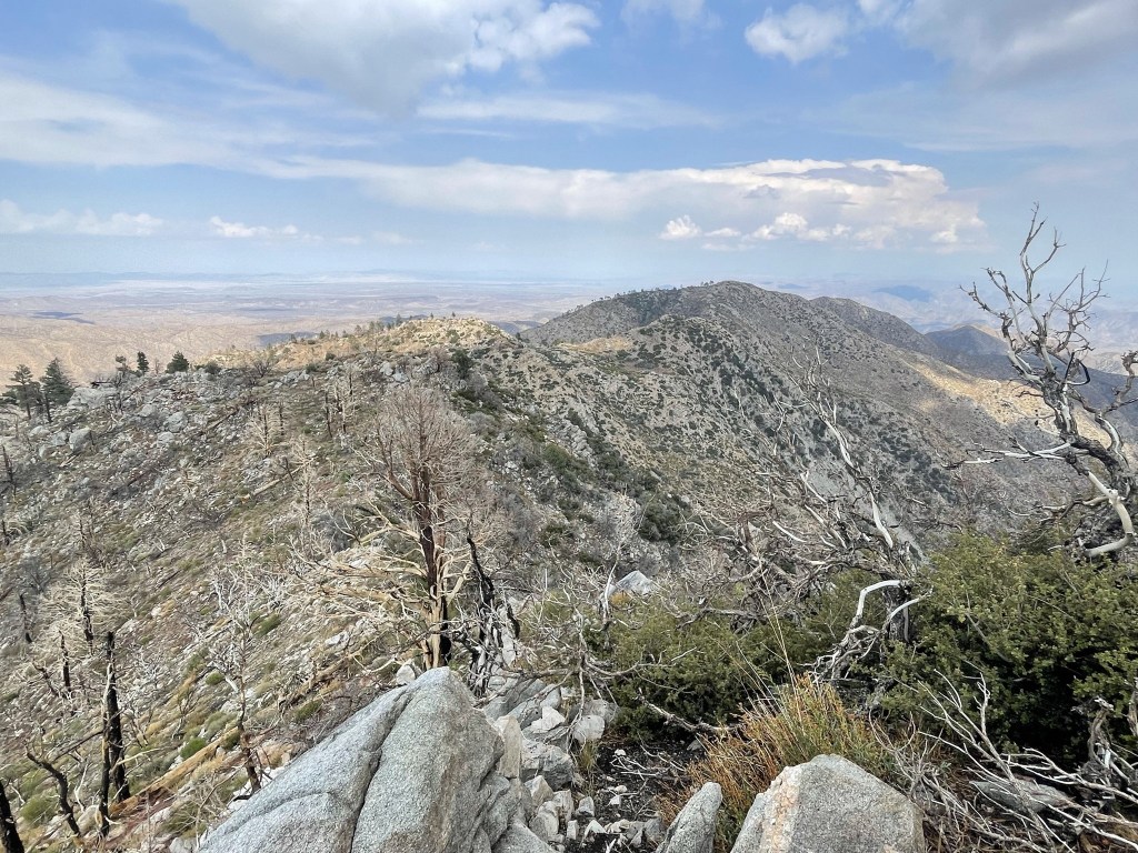 I reached the summit at 10:40am at 0.7 mile. I did not locate a register. To the south I could see San Gorgonio (left center) and Grinnell Mountain (center).