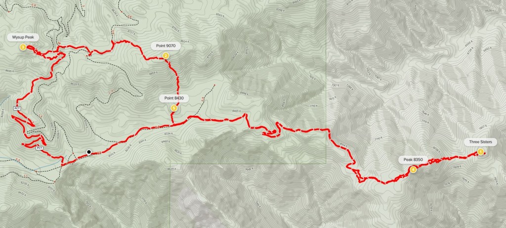This is the usual starting point for Three Sisters. The standard hike is to follow the road past the gate for 3.5 miles and then proceed cross country for about a half mile to the peak. Wysup Peak is typically accessed from the north, but it was only about 2 miles away along the PCT, so I decided to combine the 2 peaks into one hike. I backtracked a short way along the road and reached the PCT at 0.2 mile.
