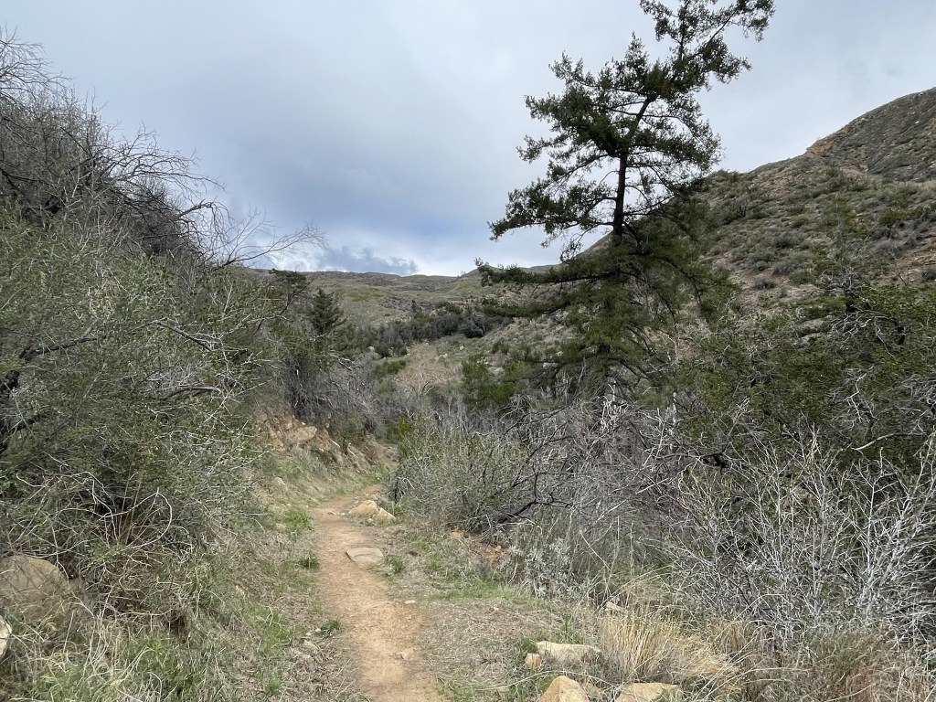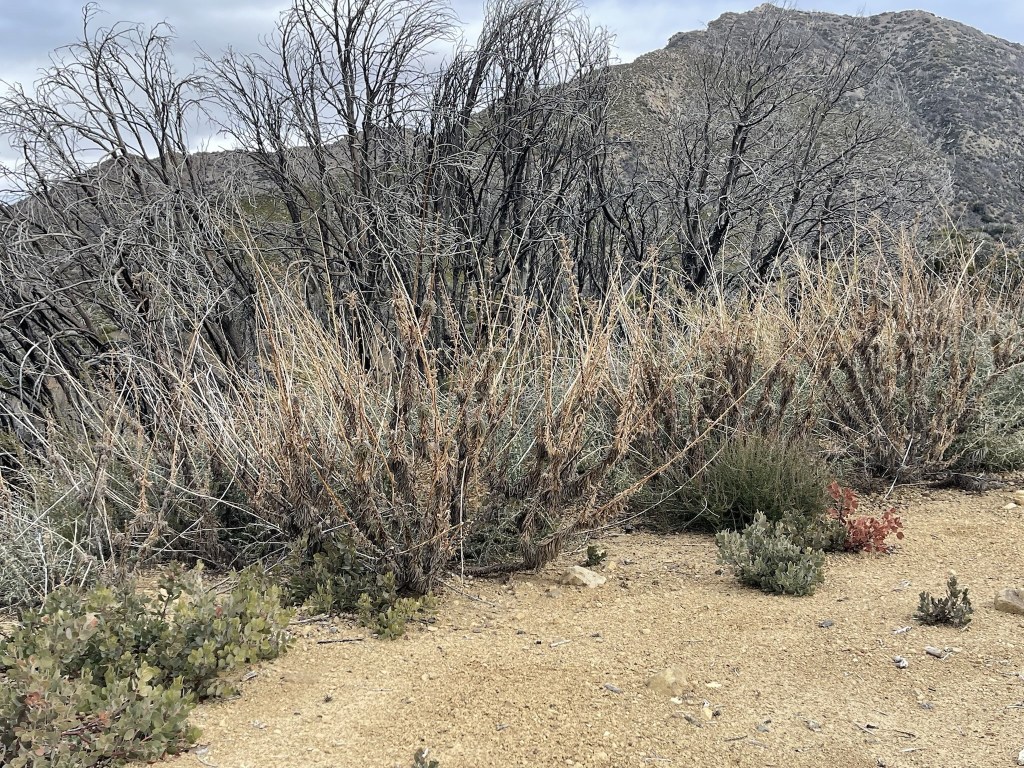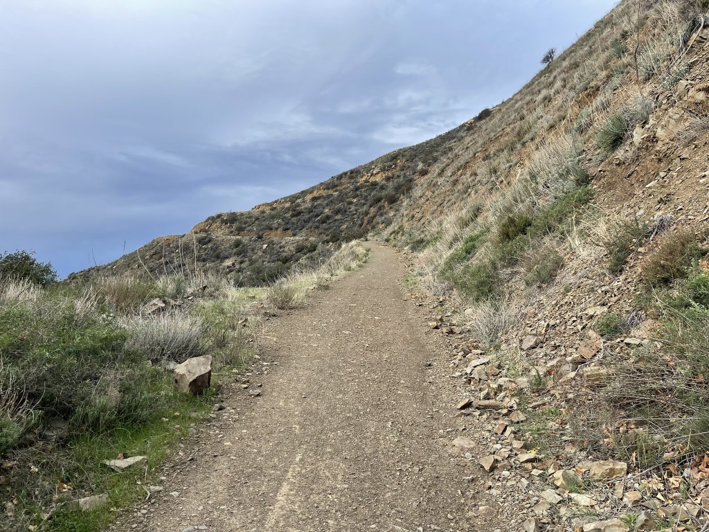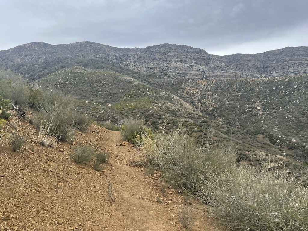 I reached the road again at 14.7 miles. From there, I retraced my steps to the Red Reef Trail which I took back down to the trailhead. Near the top of the canyon, I noticed some poodle dog bush on the side of the trail. Poodle dog bush is a plant native to Southern California that typically grows in recent burn areas. It is known to cause a similar reaction as poison oak, and many report it to be even worse. I’ve had poison oak contact before, so I don’t want to imagine what poodle dog bush would do to me. I was surprised I hadn’t noticed it on the way up, but I was thankful that the trail was wide enough that it wasn’t an issue to avoid. The leaves were brown so I’m not sure if the plants were dead or not.