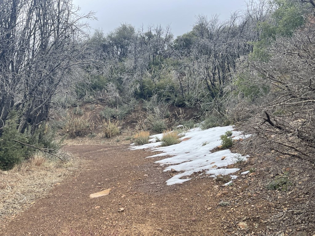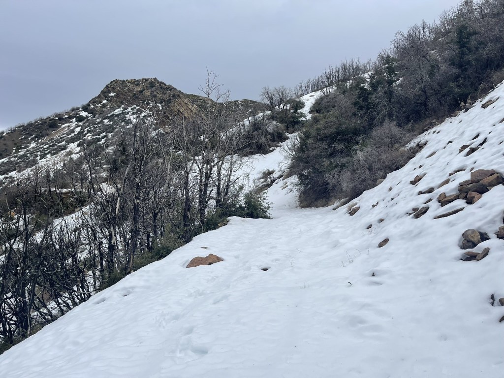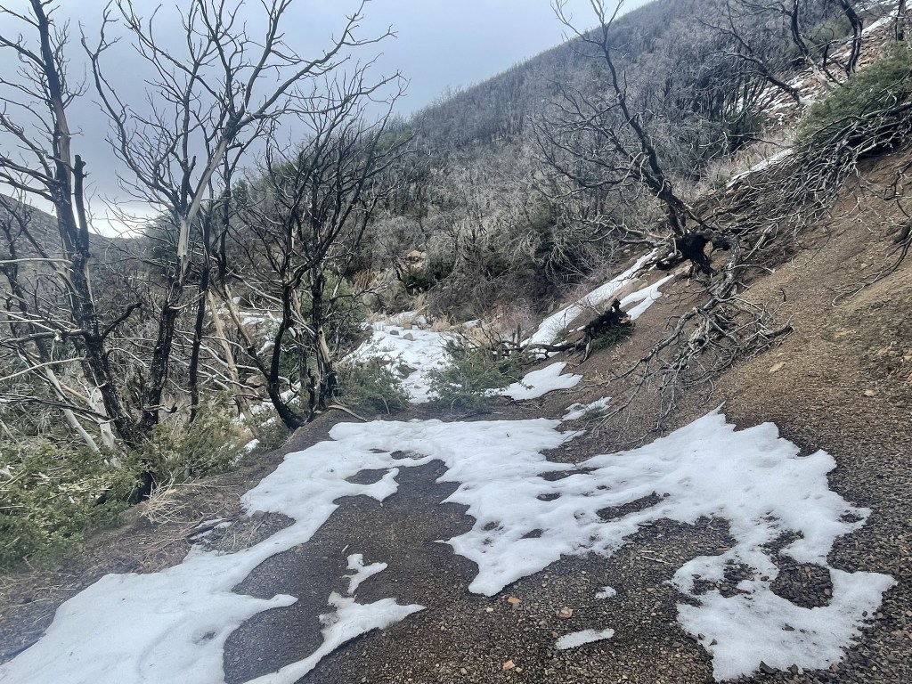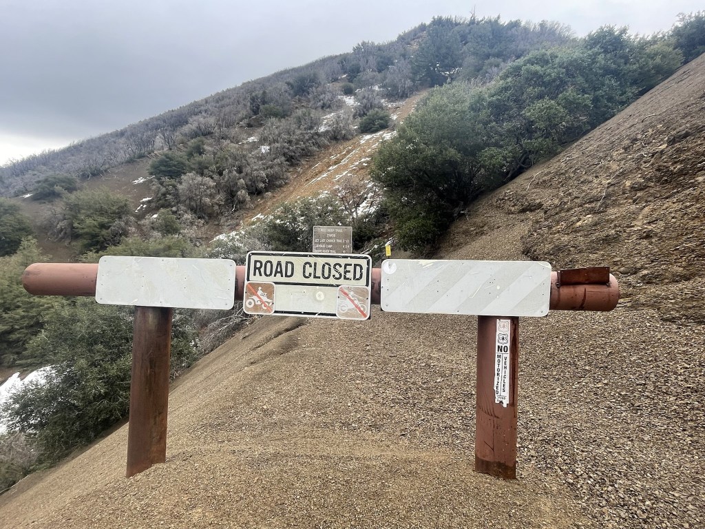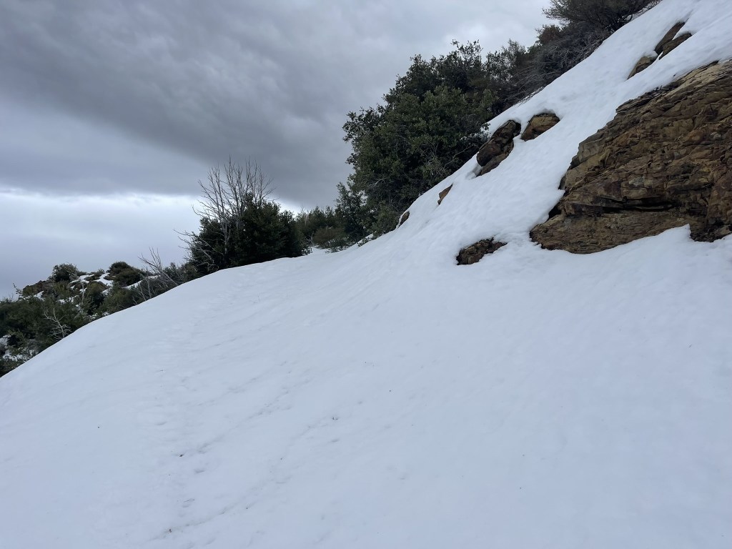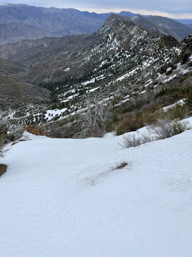 The road continued east as it wound its way along the north side of Topatopa Bluff. The north facing slope was covered in a few inches of snow.