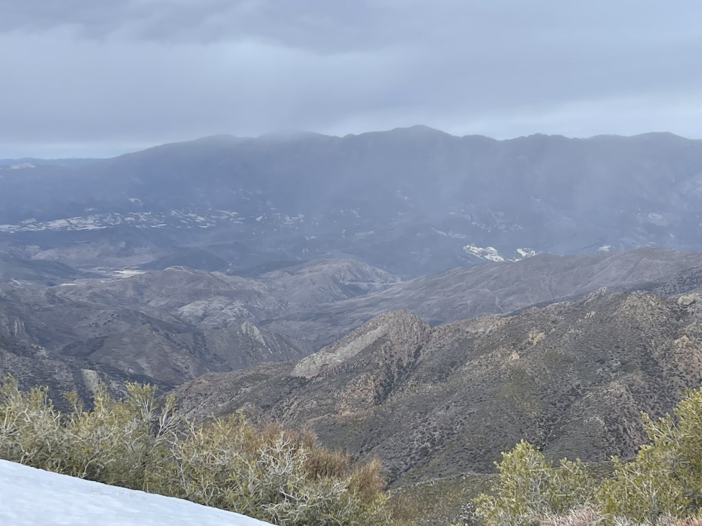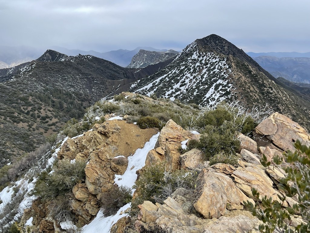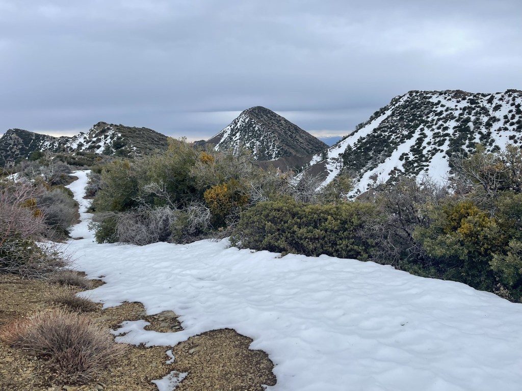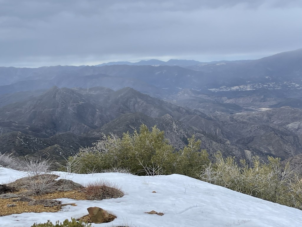 I reached the summit at 12:23pm at 10.4 miles! I did not locate the register since it was likely buried in the snow. The views were decent despite the cloud cover. To the north I could see Mount Pinos, the highpoint of Ventura County.