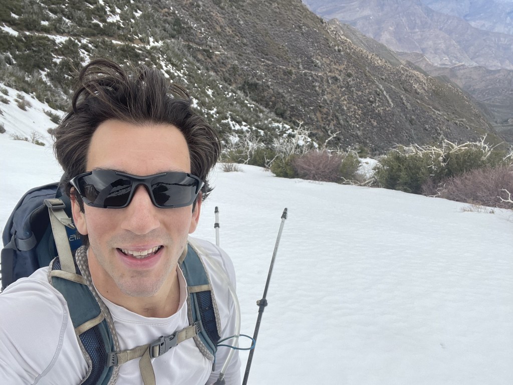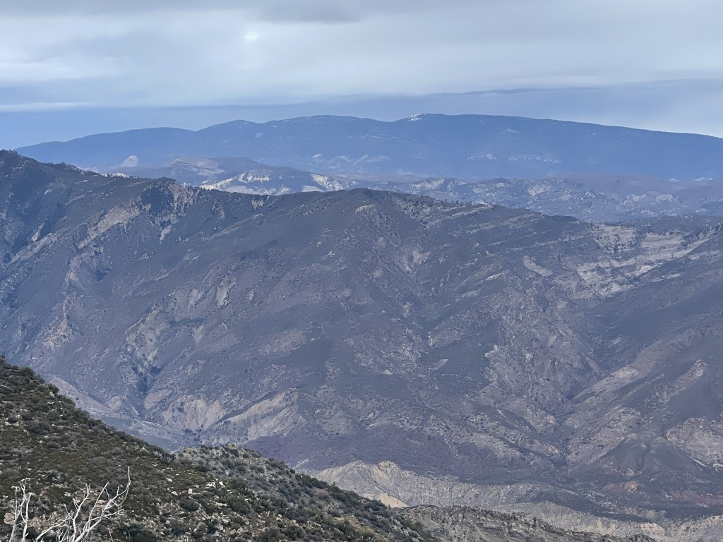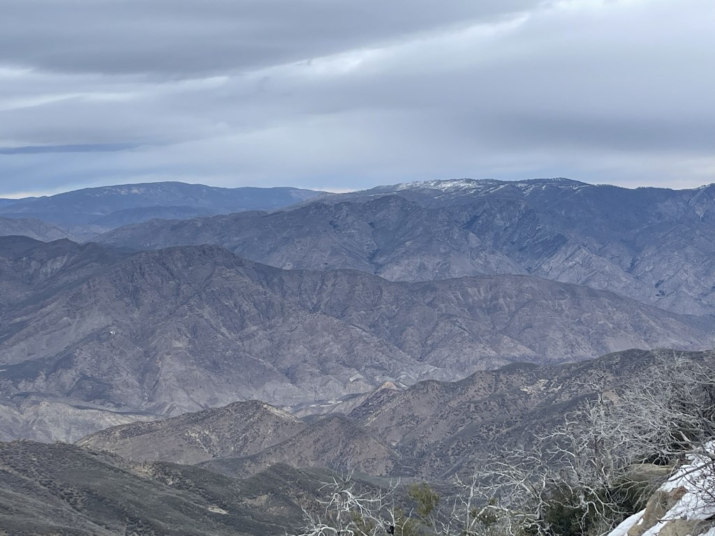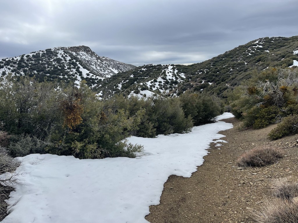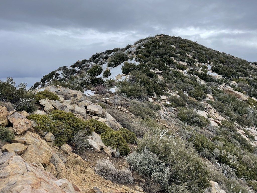 I reached the summit at 12:23pm at 10.4 miles! I did not locate the register since it was likely buried in the snow. The views were decent despite the cloud cover. To the north I could see Mount Pinos, the highpoint of Ventura County.