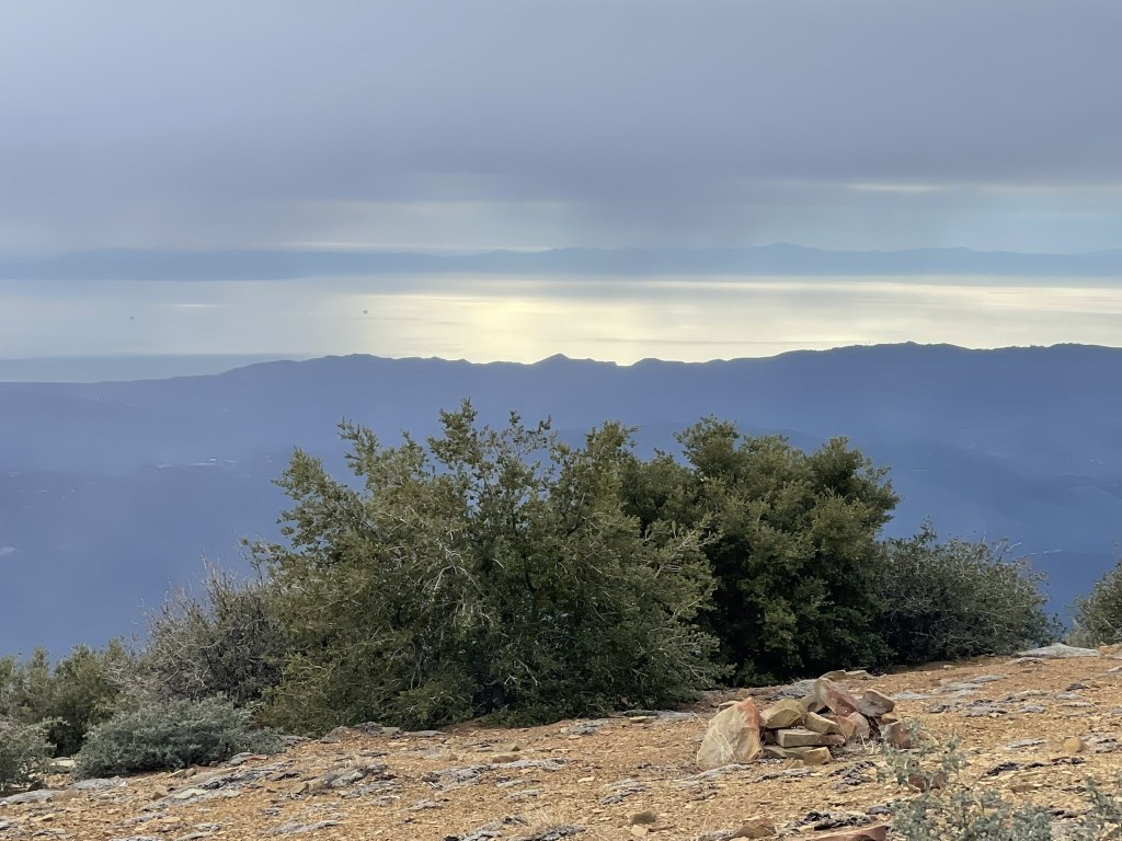 I reached Topatopa Bluff at 2:18pm at 14 miles. The summit area was flat and looked like would be good for camping. There were a number of small rock piles.