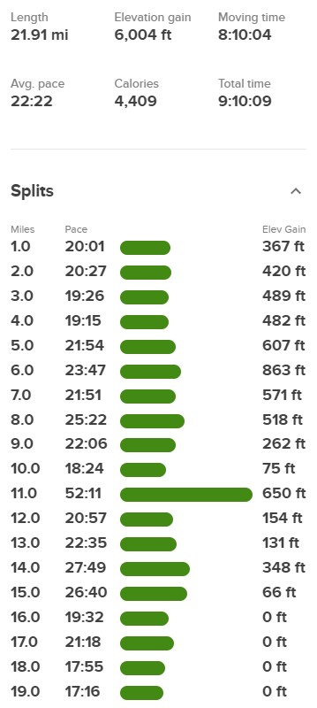 I made good time back to the trailhead. The campsites at White Ledge Campground were now occupied, and I saw other hikers closer to the bottom. I reached the car once more at 5:12pm. Stats for this hike were 21.91 miles, 6004 feet elevation gain, and 9:10:09 total time.