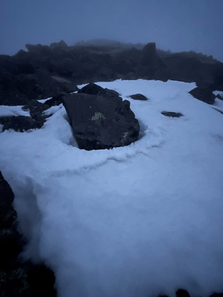 I reached a false summit at 2.3 miles at 12041 feet. It was getting very windy now and the temperature dipped below freezing. I entered a cloud layer as I neared the summit.