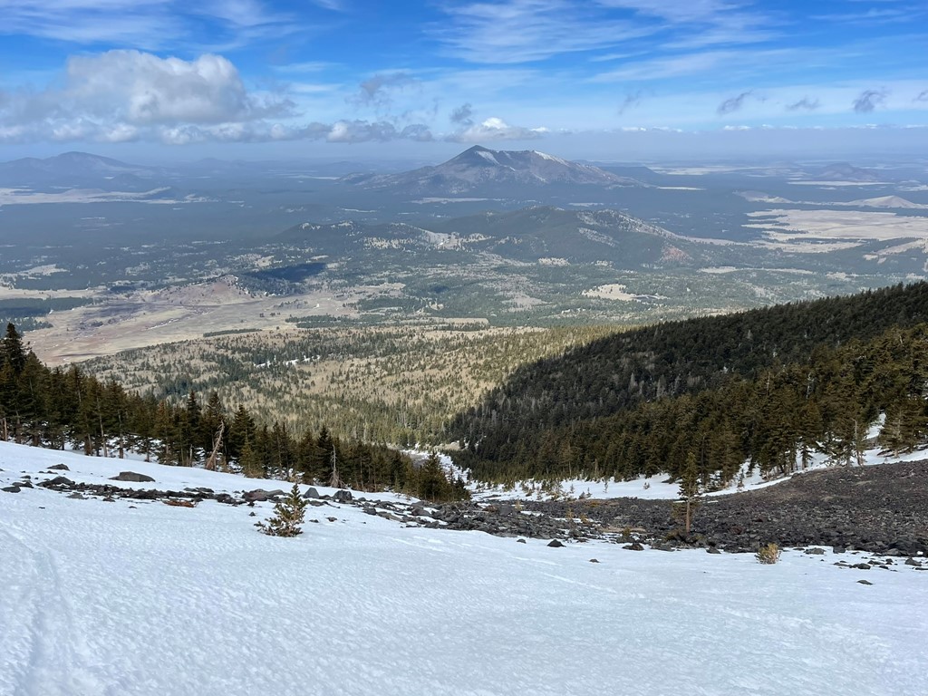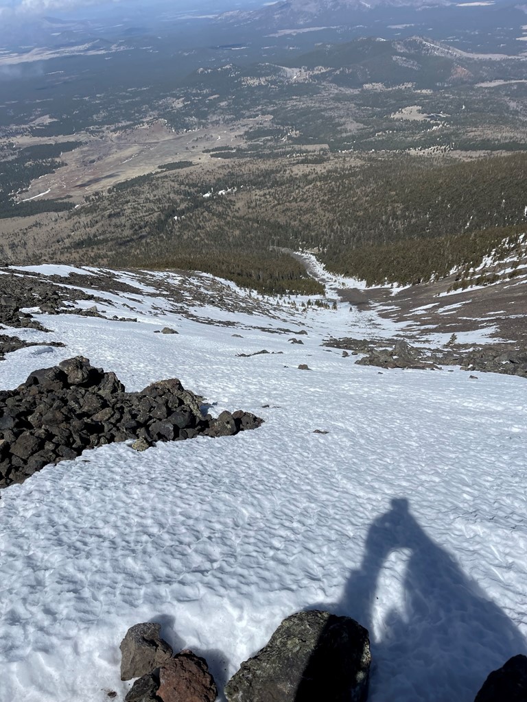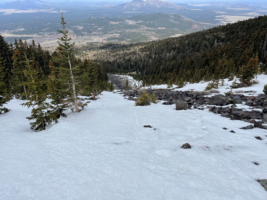 I encountered patchy snow on the ridge up to Agassiz. It is actually illegal to climb Agassiz unless there is snow on the ground because of a small, endangered plant that grows on the peak called the San Francisco Peaks Groundsel. I was able to mostly stay on the snow and was careful to not step on any plants when hopping across the boulders.