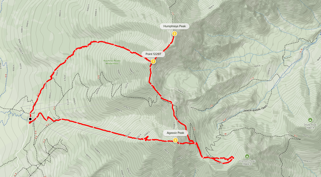 About halfway through this part the snow became less deep, so I was able to pick up the pace a little. Descending the couloir was fun but I almost regretted the decision because of this part. I finally reached the trail at 9.1 miles. From there it was a short walk back to the parking lot. I reached the car at 12:56pm. This hike totaled about 9.9 miles, 4800 feet elevation gain, and 9.5 hours. These numbers are approximate because my GPS stopped recording for a short time between Point 12297 and Humphreys Peak. I think the stats below are missing about 0.5 miles, 350 feet elevation gain, and 30 minutes.