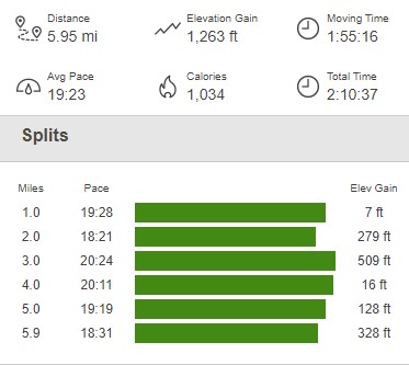 I reached the car at 2:12pm. This hike totaled 5.95 miles, 1263 feet elevation gain, and 2:10:37 total time.