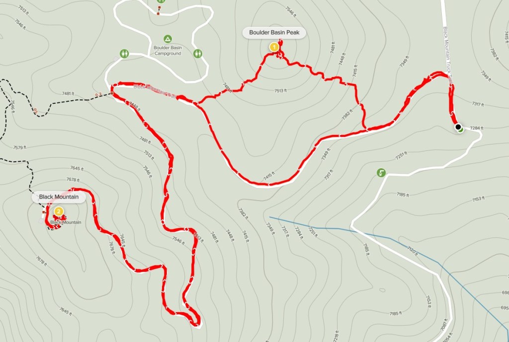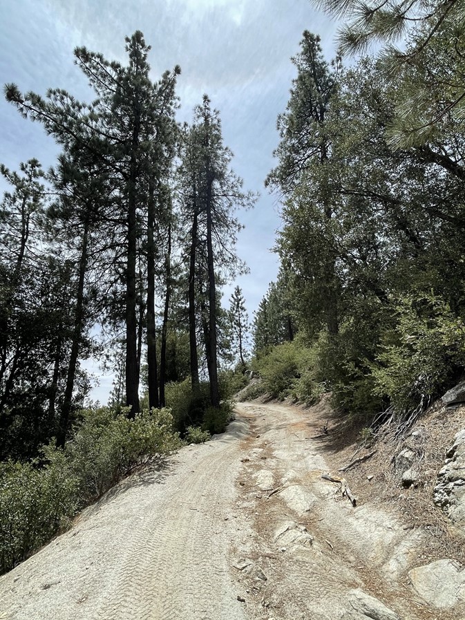I got in the car and drove 1.3 miles east to the Black Mountain Truck Trail (Forest Road 4S01). I then drove about 5 miles up the road and parked where a spur road leads to the fire lookout on Black Mountain (7772 feet). The spur road was gated and there were 20-30 cars parked on the road leading up to it. I was expecting to see numerous hikers on the road to Black Mountain, but I found out later that this area is very popular for bouldering which likely explains all the vehicles. I started this hike at 2:55pm from 7303 feet.