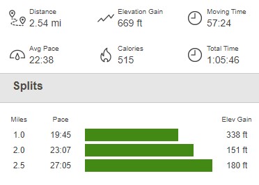 I reached the car again at 4:01pm. This hike was a short 2.54 miles, 669 feet elevation gain, and 1:05:46 total time.