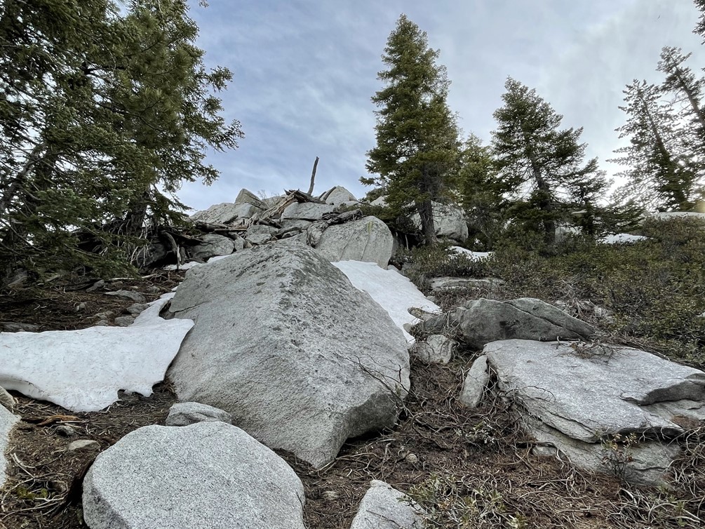 I left the trail at 1.9 miles and climbed up to the ridge. Unfortunately, the ridgeline was too rocky to stay right on top of it. I was hoping I could hike on the south side of the ridge to avoid the snow but there were steep cliffs on that side.