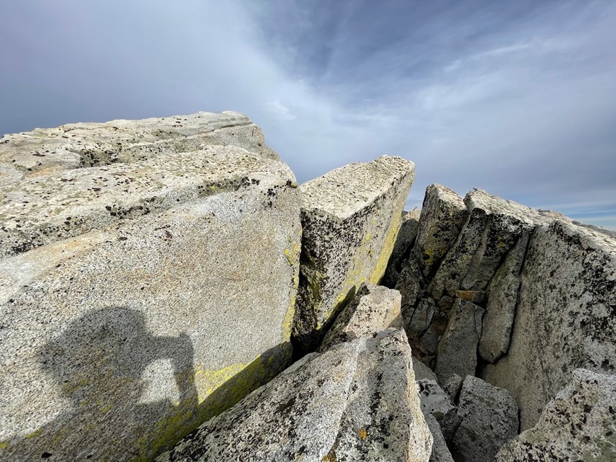 I stayed on the north side of the ridge which thankfully wasn’t too difficult. There were some snowdrifts to cross and I postholed up to my thighs a few times. I soon reached the summit area and climbed up the low class 3 summit block. I was on top at 5:26pm at 2.2 miles!