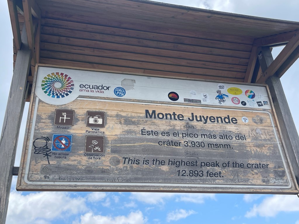 At 3.5 miles we reached another point along the rim called Quilotoa Peak on Peakbagger. The elevation is listed on Peakbagger as 12841 feet which would make it only 3 feet lower than Monte Juyende, but we estimated the elevation to be closer to 12600 feet. We were about halfway around the lake at this point. Looking back on Monte Juyende:
