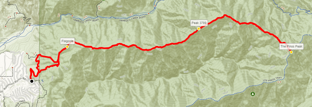 I woke up at 5am and I was out the door by 5:30 heading north towards Orange County. After spending the last few weekends hiking in the desert, I decided to mix things up and do some hiking in the Santa Ana Mountains. The Santa Anas are a small mountain range that divides Orange County from Riverside County. The relatively low elevation of the range makes it good for this time of year (and horrible for summer). The range tops out at Santiago Peak, which is 5689 feet above sea level, but most of the peaks are between 3000 and 5000 feet. My destination today would be Los Pinos Peak, which is 4513 feet above sea level. Los Pinos is on the Sierra Club Lower Peaks Committee List, which is a list of 84 peaks in Southern California below 5000 feet. Up to this point I had completed 20/84 peaks on the list, the most recent being Morton and Cram Peaks in the foothills of the San Bernardino Mountains. The standard route to Los Pinos starts near Blue Jay Campground and is about 6 miles round trip. However, I had read reports of a route that starts from the Orange County lowlands and climbs up a steep ridge all the way to the summit. This route would be nearly 14 miles and would require over 4000 feet of elevation gain. The net elevation between the trailhead and the summit is only about 3000 feet but there are many ups and downs along the ridge which add to the cumulative elevation gain. I was up for the challenge, so I chose this route over the standard route. It took me about 1 hour 20 minutes to drive to the trailhead, which is in a suburban neighborhood in Rancho Santa Margarita. I was expecting to have the trail mostly to myself this morning, so I was a little confused to find about 30 cars parked on the side of Robinson Ranch Road when I arrived. There aren’t any homes in the immediate vicinity, so I was a little worried there was a huge group on the trail above me already. At 6:54am I began hiking from the trailhead at 1461 feet.