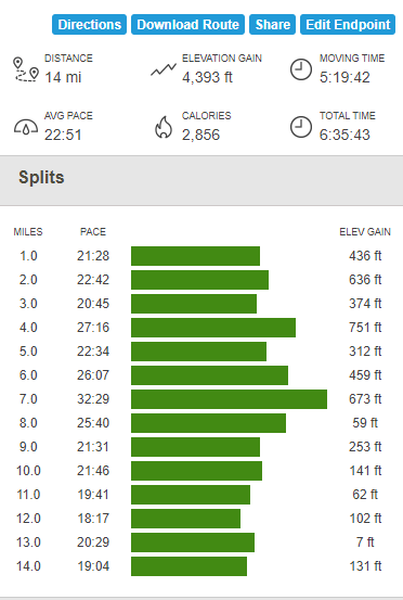 The rest of the trip was uneventful. I passed a few more groups of people heading up, most of them likely just stopping at the flagpole summit. I stayed on the main trail instead of taking the shortcut I used earlier. I finally reached the car again at about 1:30pm. Totals for the hike were 14 miles, 4393 feet elevation gain, and 6:35:43 total time