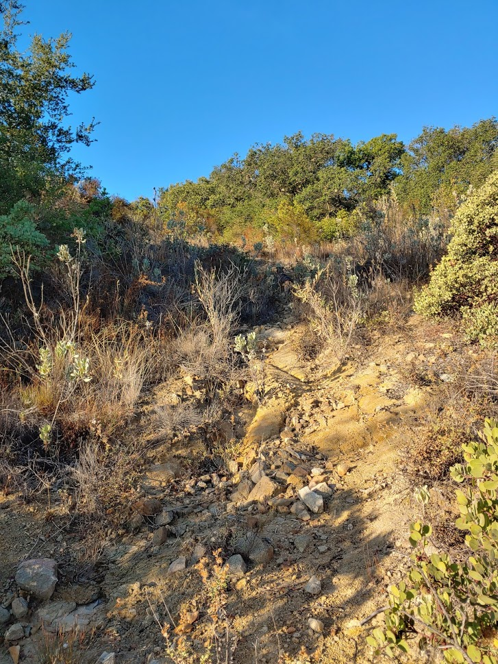 Here the unmaintained trail turns to the right and heads steeply up the eastern slope. This is a no-nonsense approach, gaining around 600 feet of elevation in about a half mile. The trail was overgrown and hard to follow in spots, but we were able to make pretty good progress up to the peak.