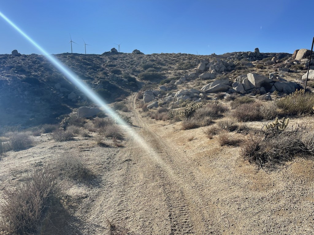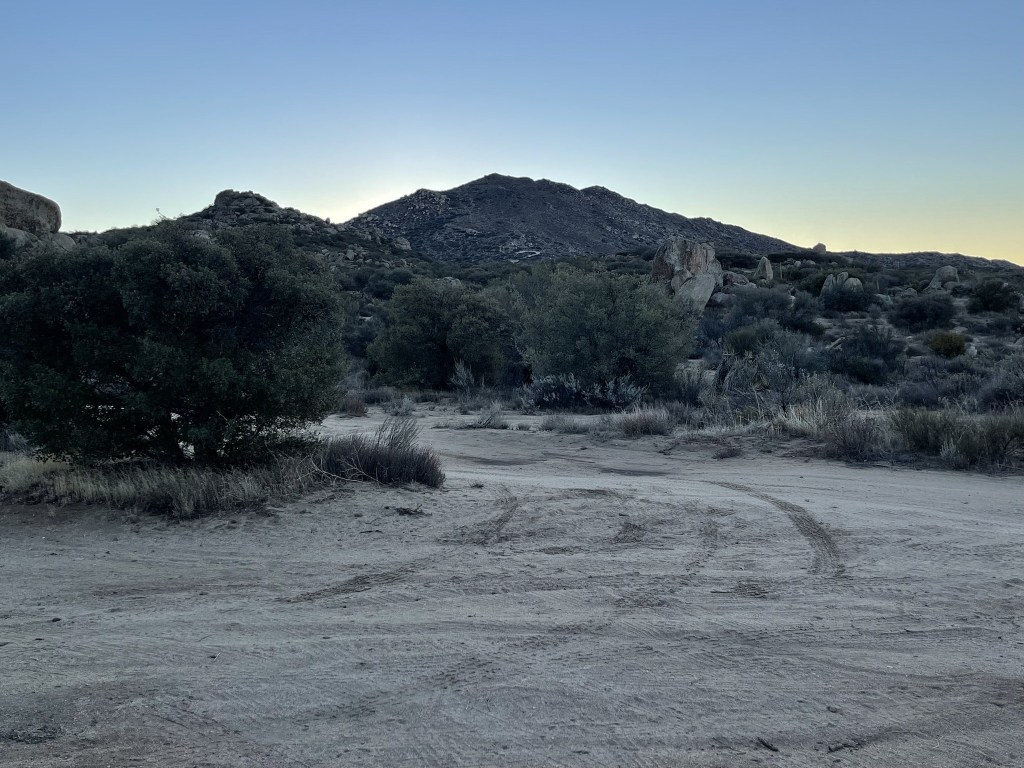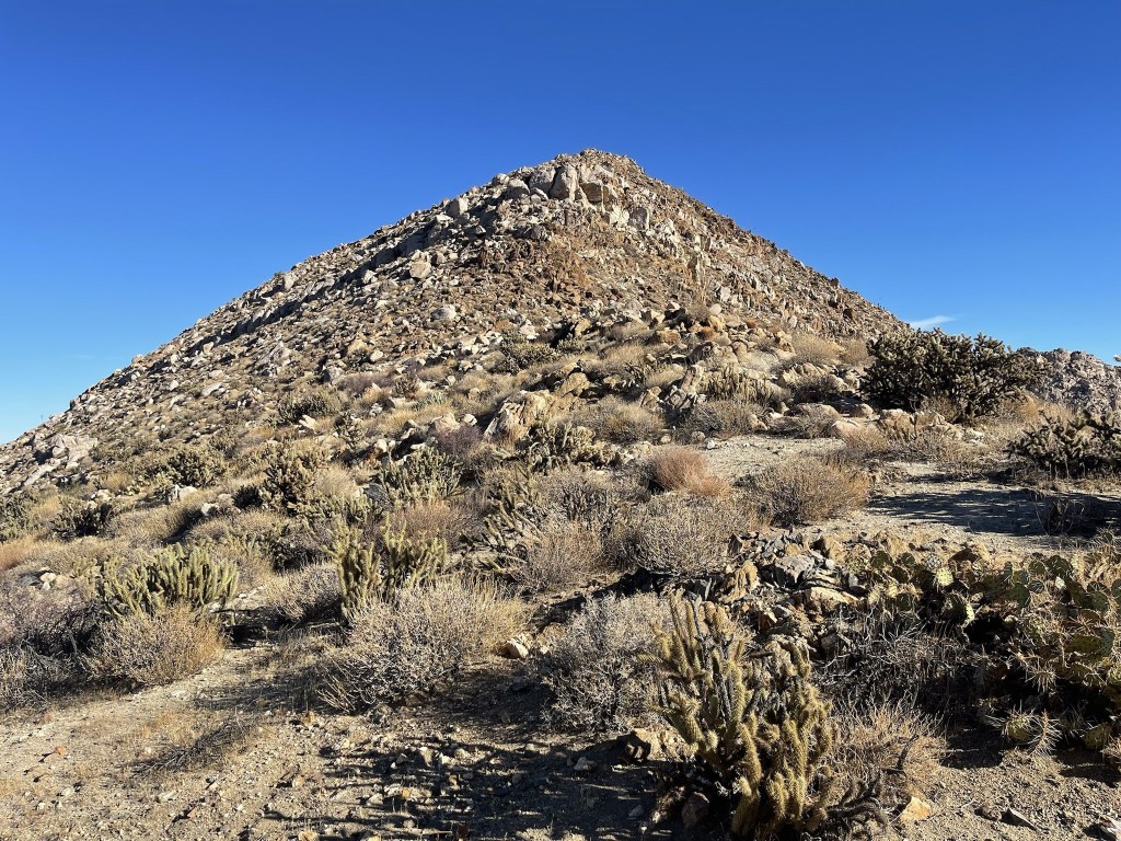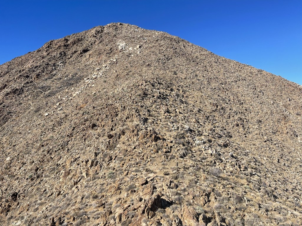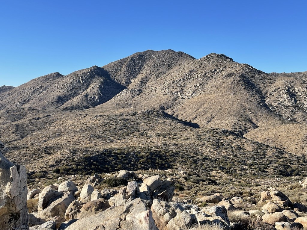 McCain Valley is a desert area in San Diego County between the higher Laguna Mountains on the west and Anza Borrego Desert State Park on the east. It contains the In-Ko-Pah Mountains, which is a small range that tops out at 4647 feet at the summit of Mount Tule. Cooler winter temperatures meant it was finally time to return to the desert and climb the few remaining peaks I had on the San Diego County 100 Peaks List. I had been stuck on 95/100 for quite some time. My most recent outing had been Collins Benchmark and Knob Benchmark the previous April. There were 2 remaining peaks on the list in the McCain Valley area – Groan Benchmark (2732 feet) and Gasp Benchmark (3223 feet). My plan was to do a large counter-clockwise loop climbing Mount Tule, Rozzie Mountain (3679 feet), Groan Benchmark, and Gasp Benchmark. I had previously climbed Mount Tule in January 2019, but it was on the way and didn’t make sense to skip. I also was considering climbing Grunt Benchmark (2144 feet), which is located 1 mile north of Gasp Benchmark and would require re-climbing Gasp in order to complete the loop. I left home at 5:30am and drove about 1 hour 10 minutes to McCain Valley. From McCain Valley Road, I drove 1.2 miles northeast on Sacotone Overlook Road to an intersection with another road heading northwest. Sacotone Overlook Road is pretty rutted, so high clearance is required. My car was showing 28 degrees as I was parking. I began this hike at 6:51am from 3973 feet above sea level. I could see Mount Tule a mile or so to the southeast: